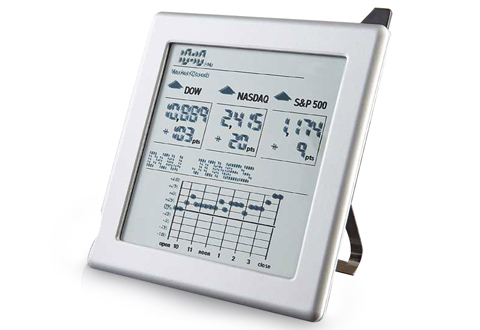 The first wireless, continuously updating stock market monitor in the world is here. Monitor the Dow, NASDAQ, and S&P 500. Easy to read data and graphs. Magnetic back sticks to fridge or file cabinet. Or stand it on your desk.