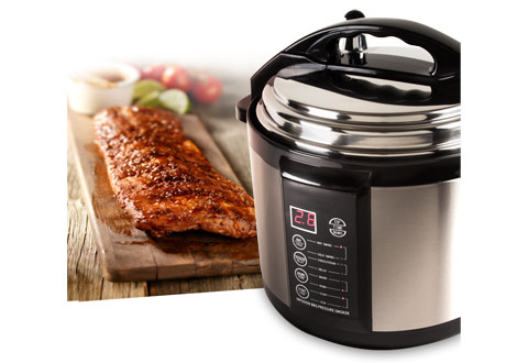 Increasing internal pressure by 15 psi, this indoor cooker cooks food up to 70% faster than traditional methods. Unique indoor chamber allows the addition of fragrant barbecue wood chips, which release their flavor-enhancing smoke for great flavor and aroma. Or, use as a traditional pressure cooker. Adjustable rack holds up to 4 lbs of food.