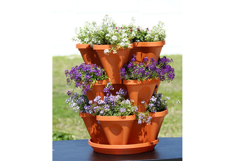 The terracotta colored plant stackers are made of durable polypropylene with UV inhibitors that prevents fading and cracking. They can hang from a ceiling, porch overhang or tree branch, or you can set them freestanding on any flat surface. The Stackable Flower/Herb Garden is the perfect choice if you like to savor delicious strawberries out of season, lush beautiful flowers all year long or want to harvest your own homegrown herbs with a snip snip whenever you need them. Makes a wonderful gift that keeps giving all year long. Includes hanging chain with swivel base.