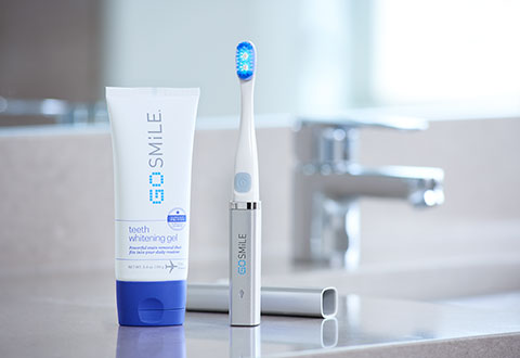 Whiten teeth when you travel with the Blue Light Whitening Travel Toothbrush. It has a built-in blue light that kills bacteria and accelerates the whitening process.