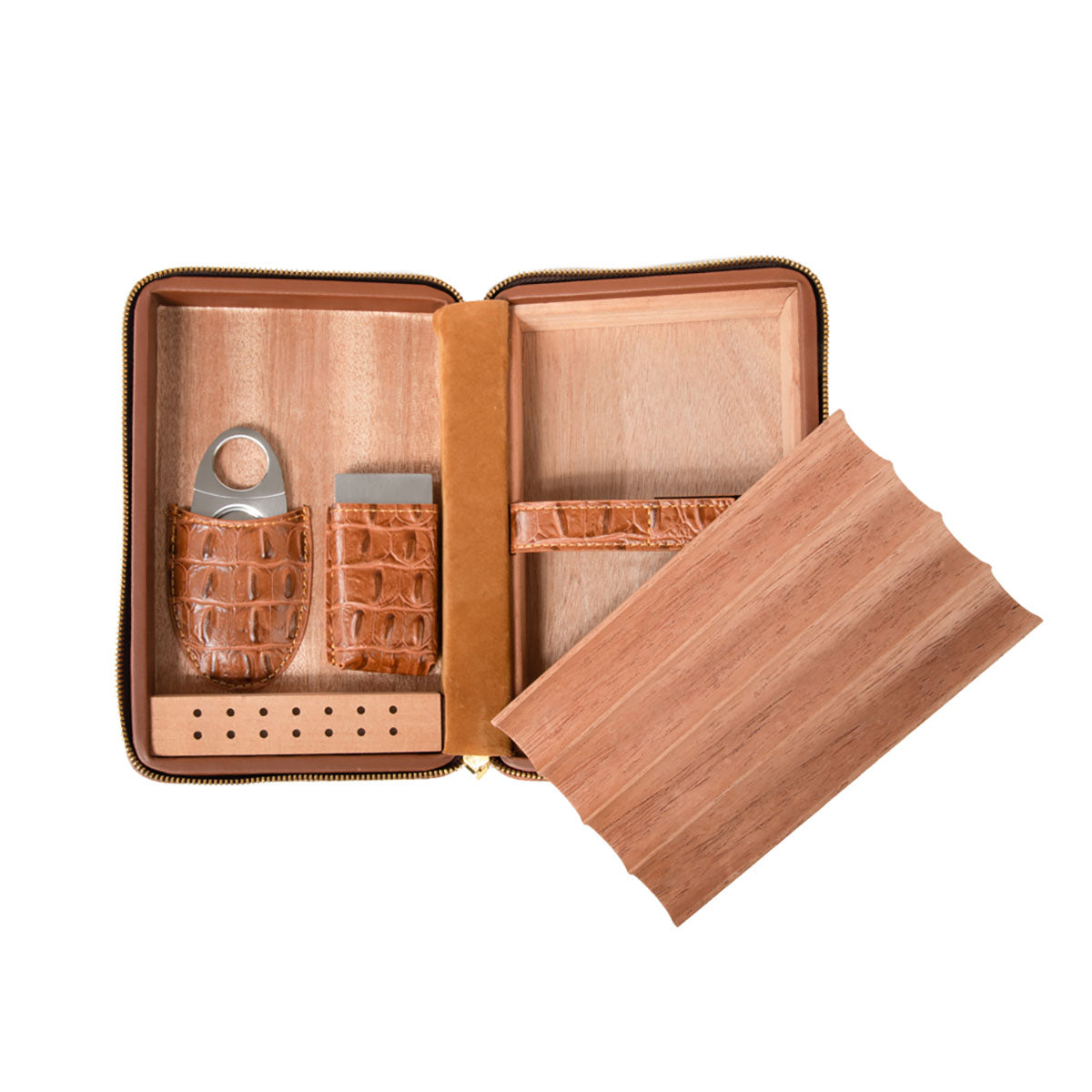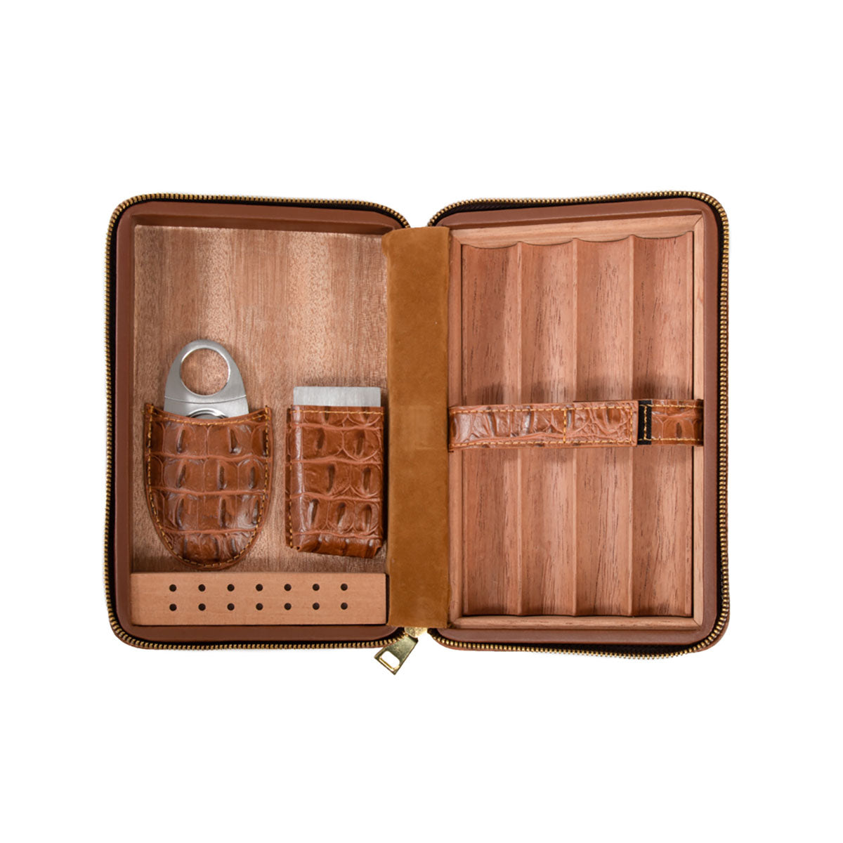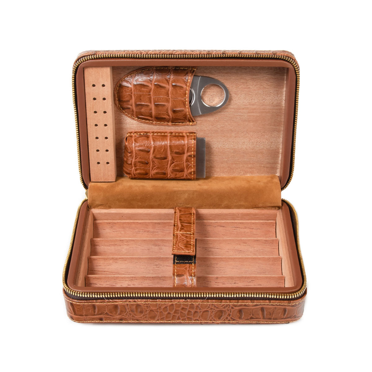 Elevate your cigar experience with the Cain Croco Cigar Travel Case. Crafted from genuine croco leather, this sleek and sophisticated travel case offers flexible storage for up to eight cigars without the removable tray or four with it. Complete with a stainless steel cigar cutter, humidifier, cigar stand, and a velvet pouch, this case combines convenience and luxury for the discerning cigar enthusiast on the move.