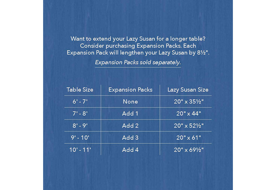- Designed to extend the Dinner Table Lazy Susan (item no. 209510)