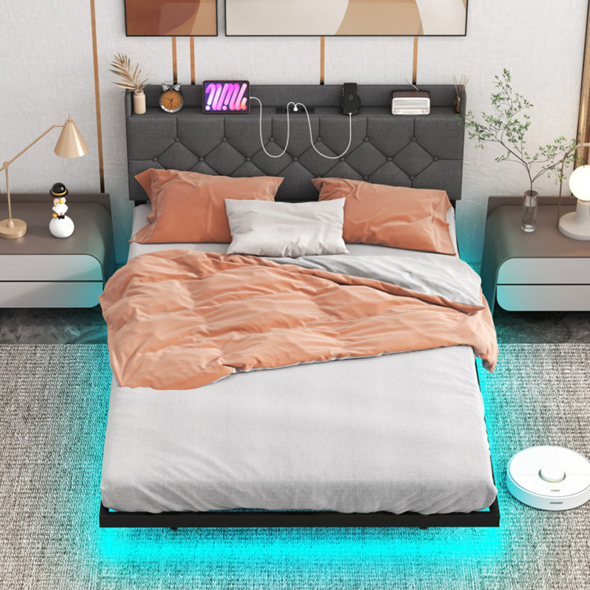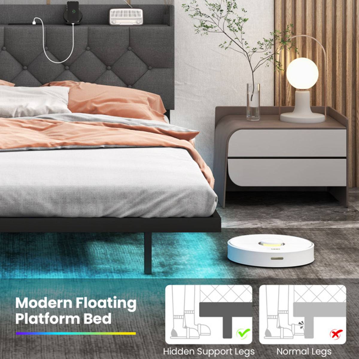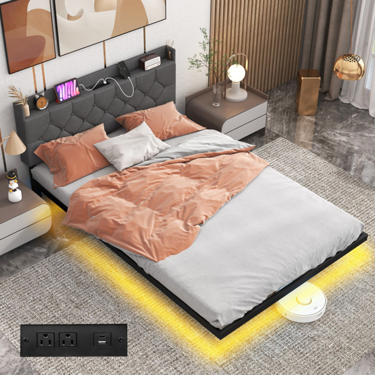 Add a futuristic edge to your bedroom with this unique floating bed frame. Hidden support legs create the illusion of a bed suspended in midair, while customizable LED lights set the perfect ambiance. The smart app-controlled lights allow you to adjust colors, brightness, and modes, even syncing with music for an immersive experience. Enjoy convenient charging with the built-in storage headboard, featuring AC outlets, USB, and Type-C ports. With breathable fabric upholstery, noise-reducing EVA foam, and a sturdy metal frame that eliminates the need for a box spring, this bed combines luxury with practicality.