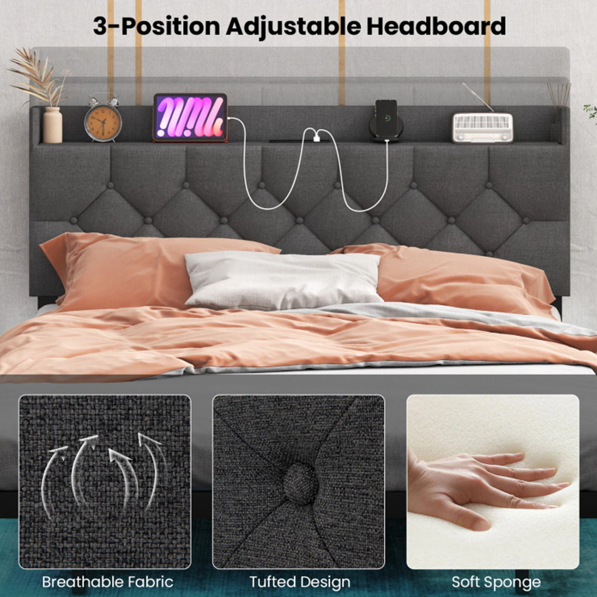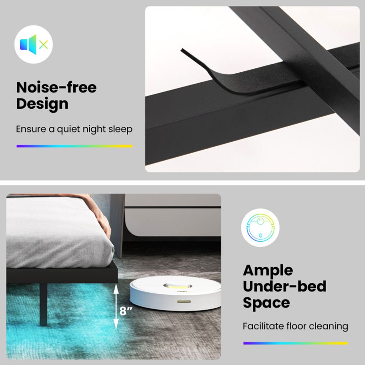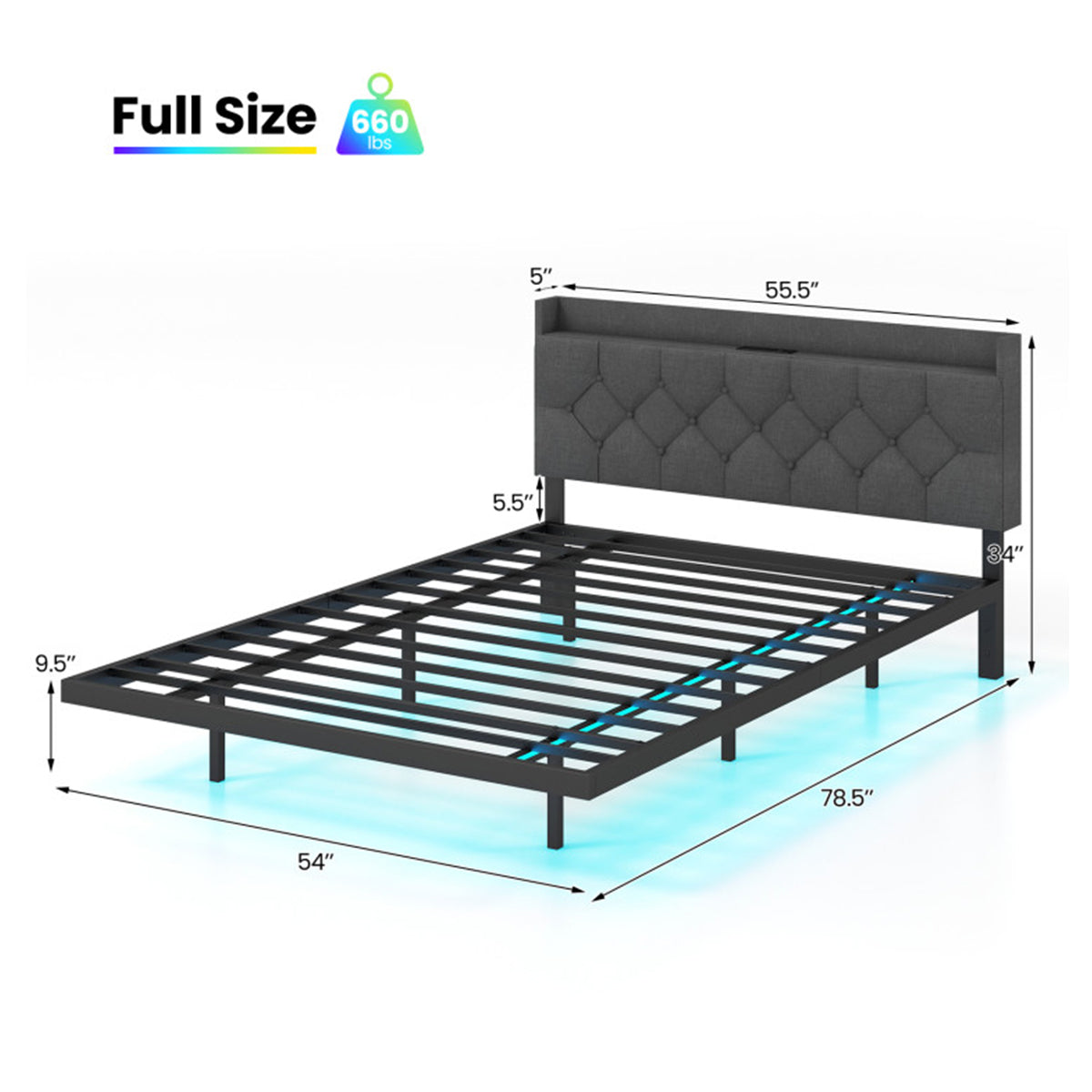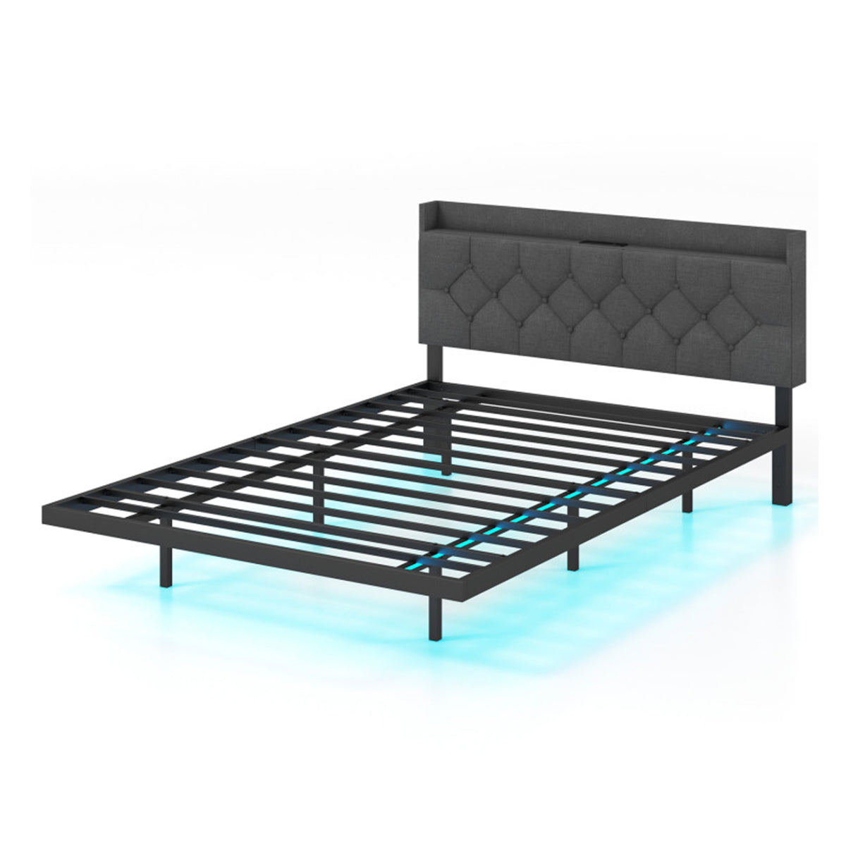 Add a futuristic edge to your bedroom with this unique floating bed frame. Hidden support legs create the illusion of a bed suspended in midair, while customizable LED lights set the perfect ambiance. The smart app-controlled lights allow you to adjust colors, brightness, and modes, even syncing with music for an immersive experience. Enjoy convenient charging with the built-in storage headboard, featuring AC outlets, USB, and Type-C ports. With breathable fabric upholstery, noise-reducing EVA foam, and a sturdy metal frame that eliminates the need for a box spring, this bed combines luxury with practicality.