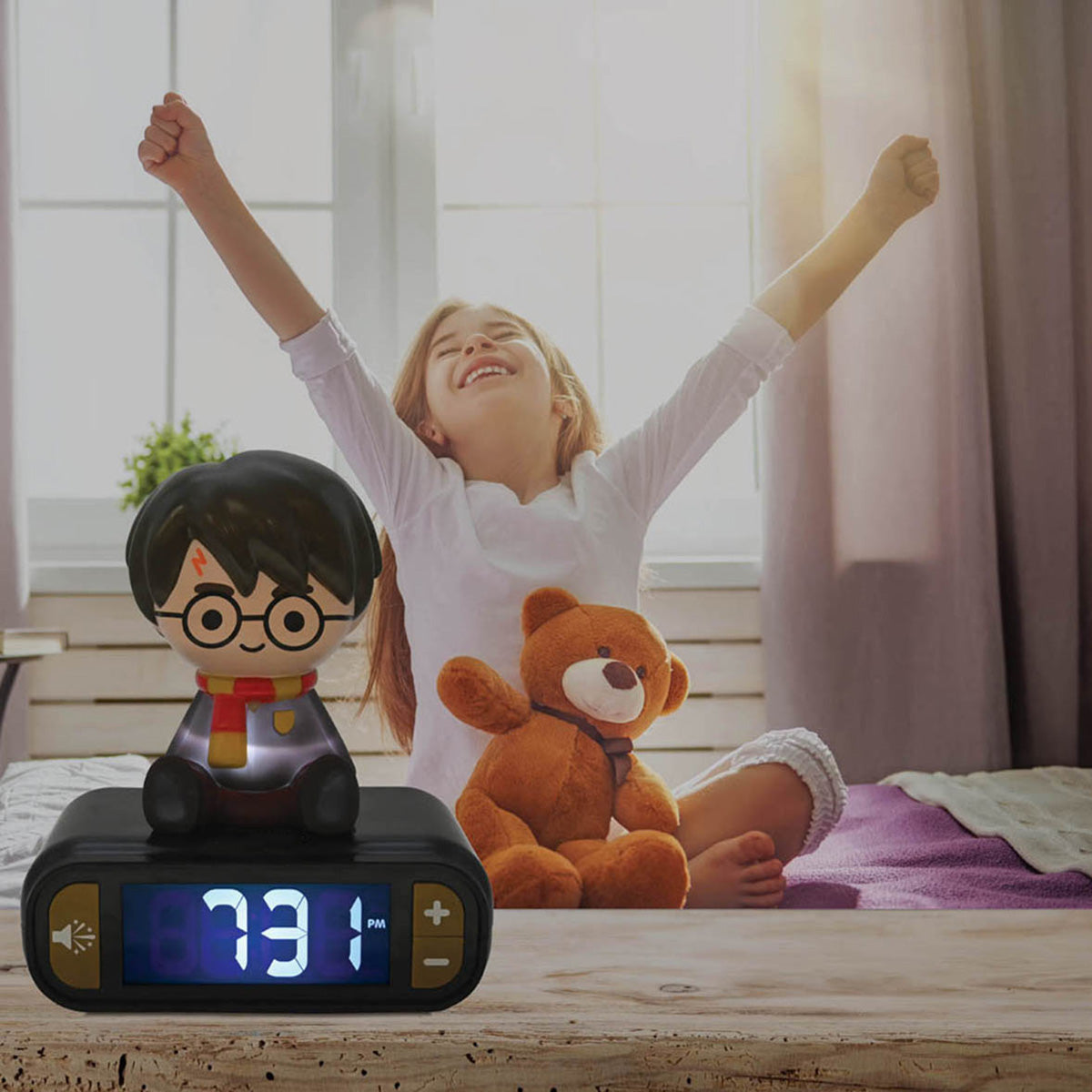 Start your day with a touch of magic using the Harry Potter Digital Alarm Clock with Nightlight. Designed especially for young fans, this adorable clock features Harry Potter, who lights up for a few minutes when pressed, adding a magical glow to your room. The sleep-friendly LCD backlit screen ensures that the time is visible without being too bright. With a selection of magic-themed alarm sounds, waking up becomes an enchanting experience. The alarm volume is adjustable to suit your preference, and it can be easily stopped with a simple press on the top of the clock or on Harry Potter himself. The snooze function gives you a few extra minutes of rest, making mornings a bit easier. The clock operates on 3 AA batteries (not included), with a low battery indicator to ensure it's always ready to go.