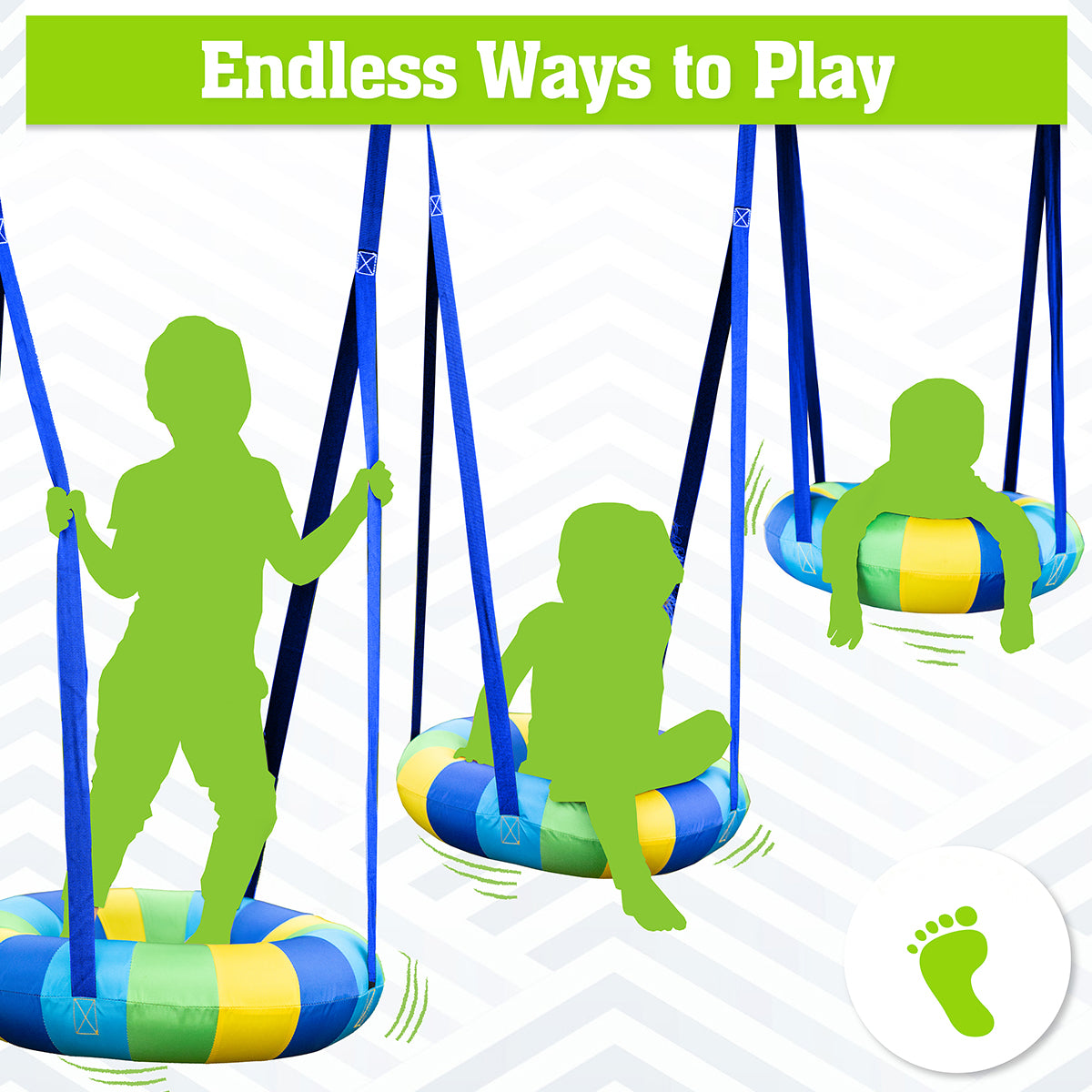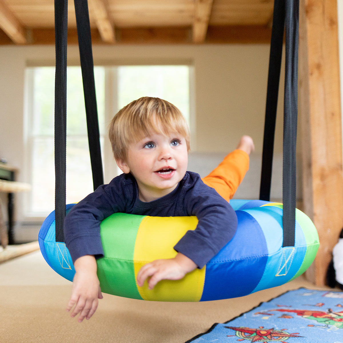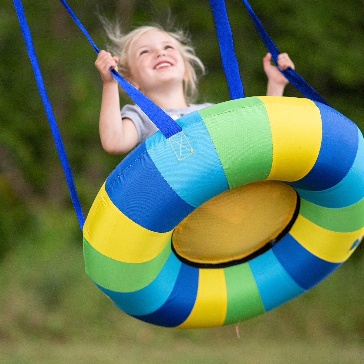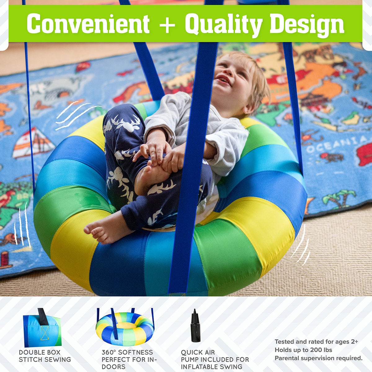 Enjoy the ultimate soft and cozy swing experience with the Inflatable Saucer Swing. This lightweight 25” swing feels like floating on air, featuring an inflatable inner tube wrapped in a durable polyester cover for safe and comfortable play. Its adjustable hanging strap extends up to 6 feet, making it ideal for indoor setups or hanging from outdoor trees or swing sets. With a weight capacity of 200 lbs, it’s perfect for children ages 3 and up, combining active fun with security. This swing’s vibrant fabric cover, complete with secure box-stitching and mesh seating, offers both style and comfort for hours of play, indoors or outdoors. For ages 3+.