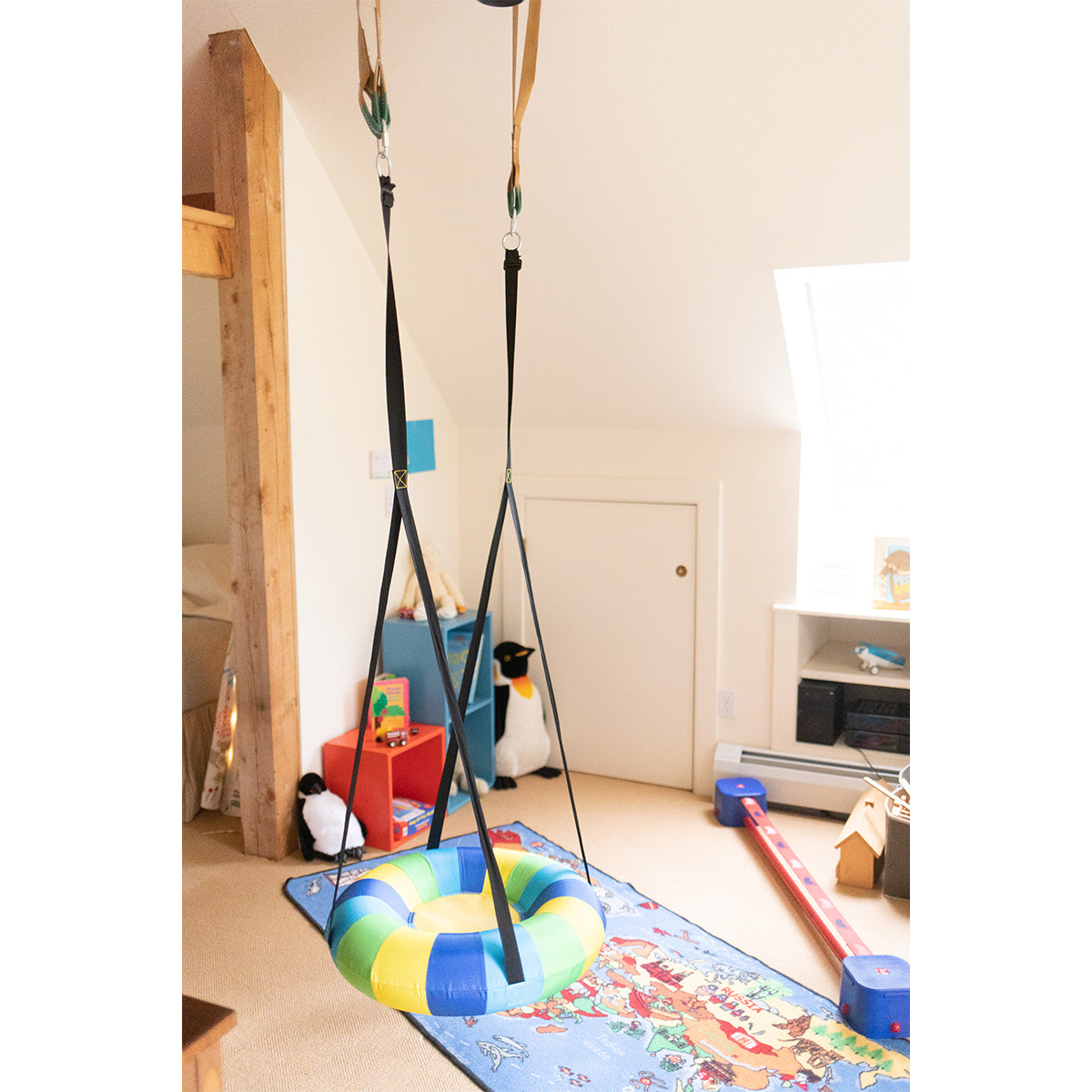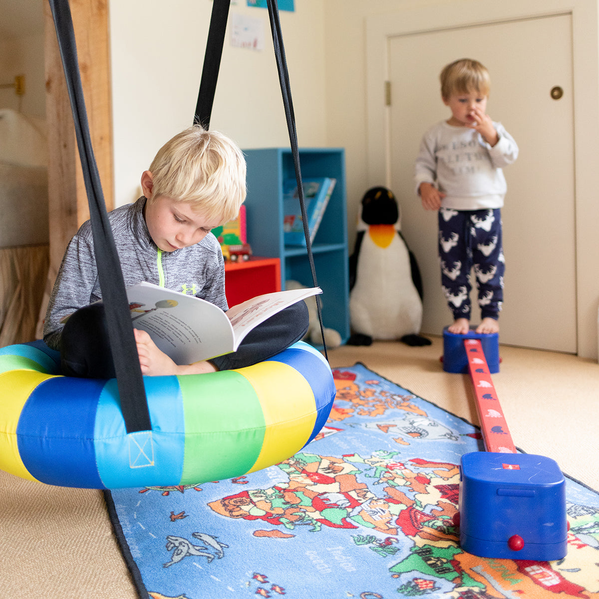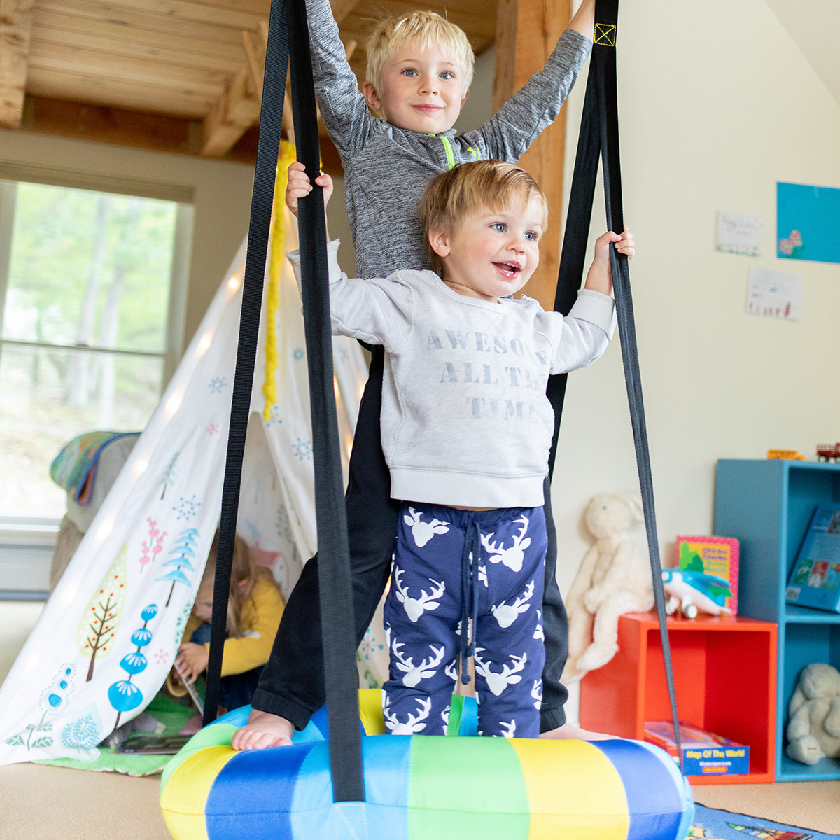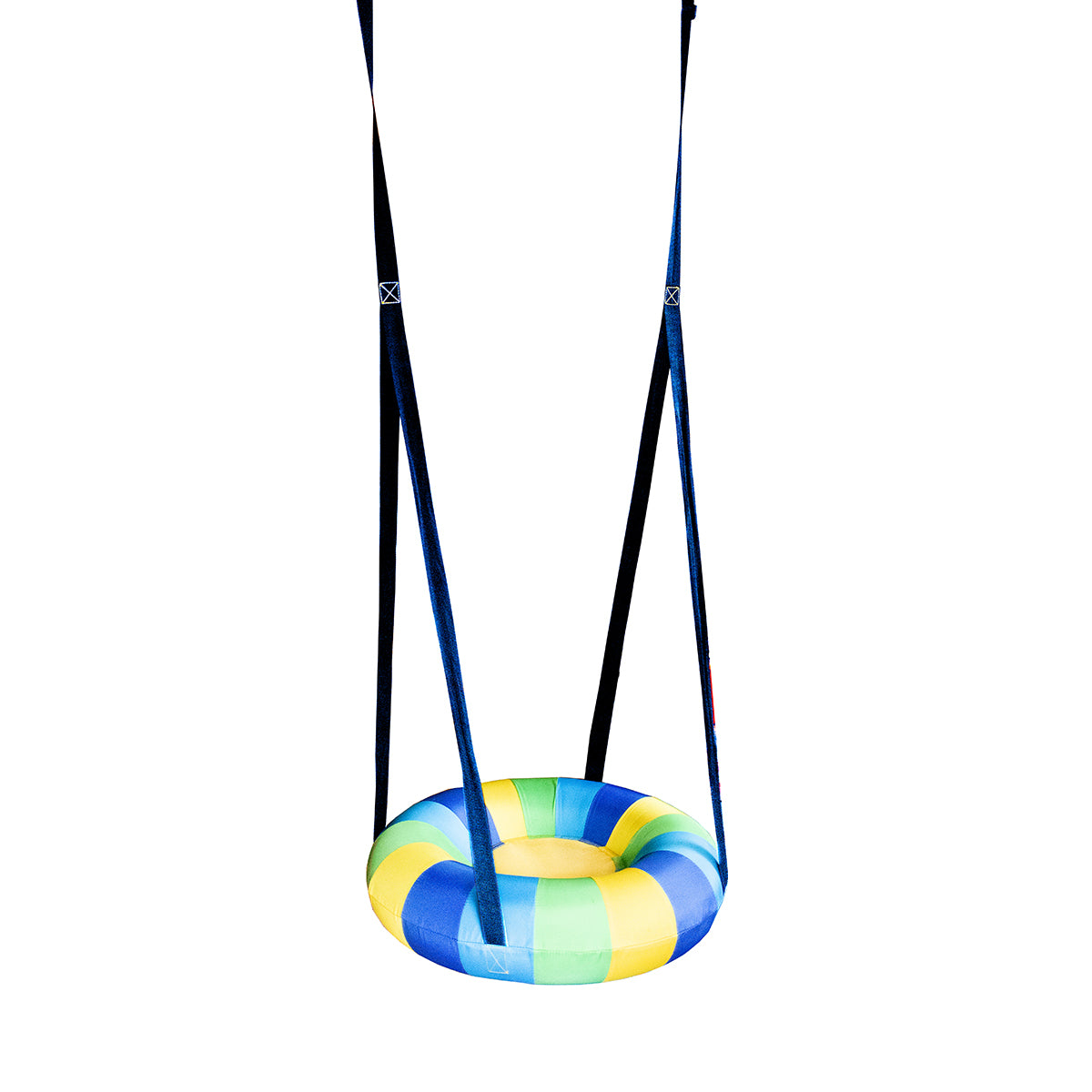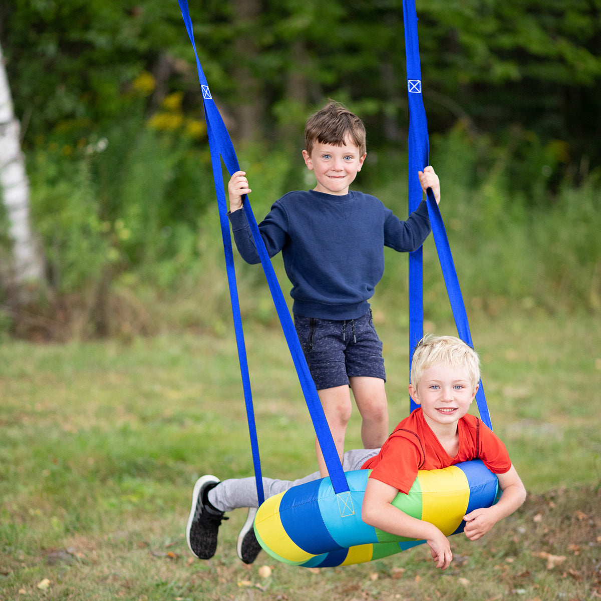 Enjoy the ultimate soft and cozy swing experience with the Inflatable Saucer Swing. This lightweight 25” swing feels like floating on air, featuring an inflatable inner tube wrapped in a durable polyester cover for safe and comfortable play. Its adjustable hanging strap extends up to 6 feet, making it ideal for indoor setups or hanging from outdoor trees or swing sets. With a weight capacity of 200 lbs, it’s perfect for children ages 3 and up, combining active fun with security. This swing’s vibrant fabric cover, complete with secure box-stitching and mesh seating, offers both style and comfort for hours of play, indoors or outdoors. For ages 3+.