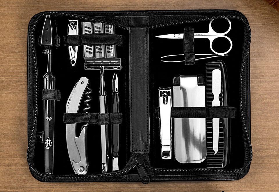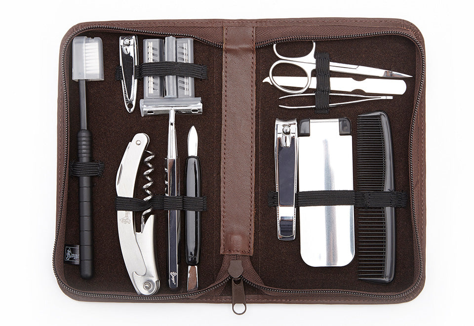 Enhance your grooming routine with the Personalized Luxury Travel Grooming Set, a comprehensive set designed for elegance and functionality, whether at home or while traveling. Encased in a zippered top grain nappa leather pouch, this kit includes essentials such as a razor, nail clippers, toothbrush, and more, all crafted for durability and style. This grooming kit is compact yet complete, making it an ideal travel companion or a thoughtful gift. Personalization includes embossing of up to 3 initials on the leather carrying case.