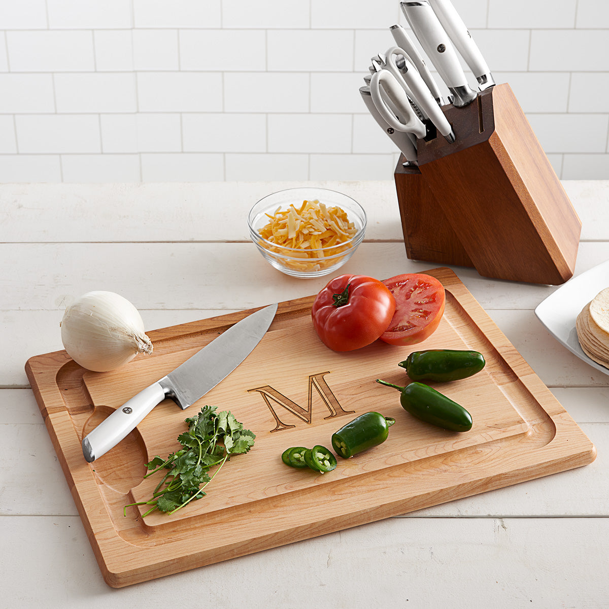 The Personalized Maple Carving Board is a beautiful and functional addition to any kitchen, perfect for those looking to add a personal touch to their cooking experience. This USA-made carving board is crafted from sustainably harvested North American maple, providing a sturdy, durable surface for meal prep or serving. It features a large cutting area with a juice groove to catch liquids, making cleanup simple. What sets this board apart is the option to have your initial finely laser-engraved in the center, creating a one-of-a-kind piece that is both practical and decorative. Whether you’re carving roasts or serving charcuterie, this personalized board makes a wonderful gift or keepsake. Engraving includes a single initial that will be 4'' and will be centered on the board.