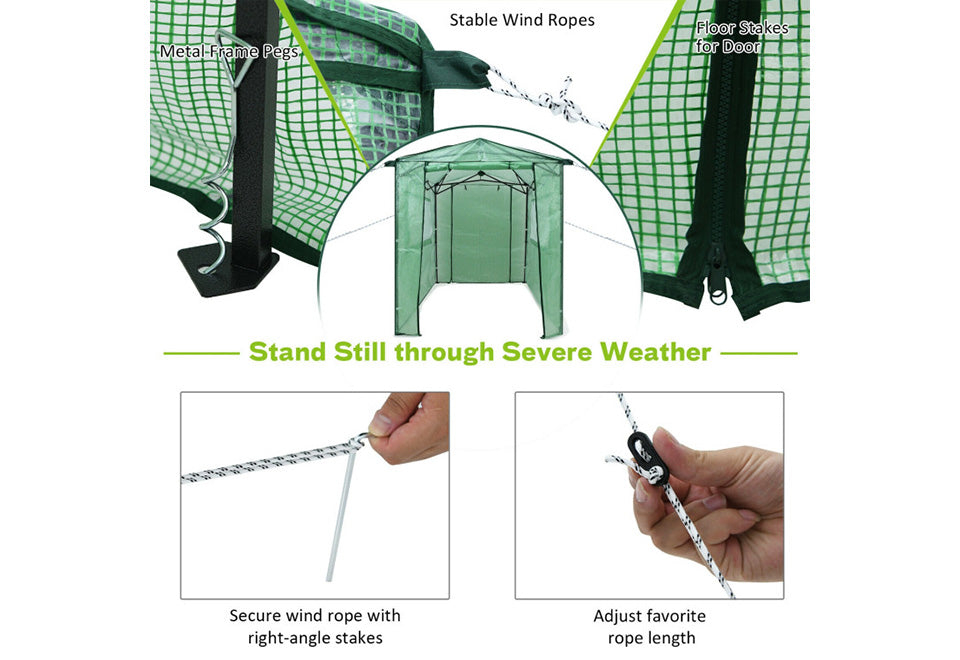 • Includes ropes, stakes and corkscrew pegs for stability