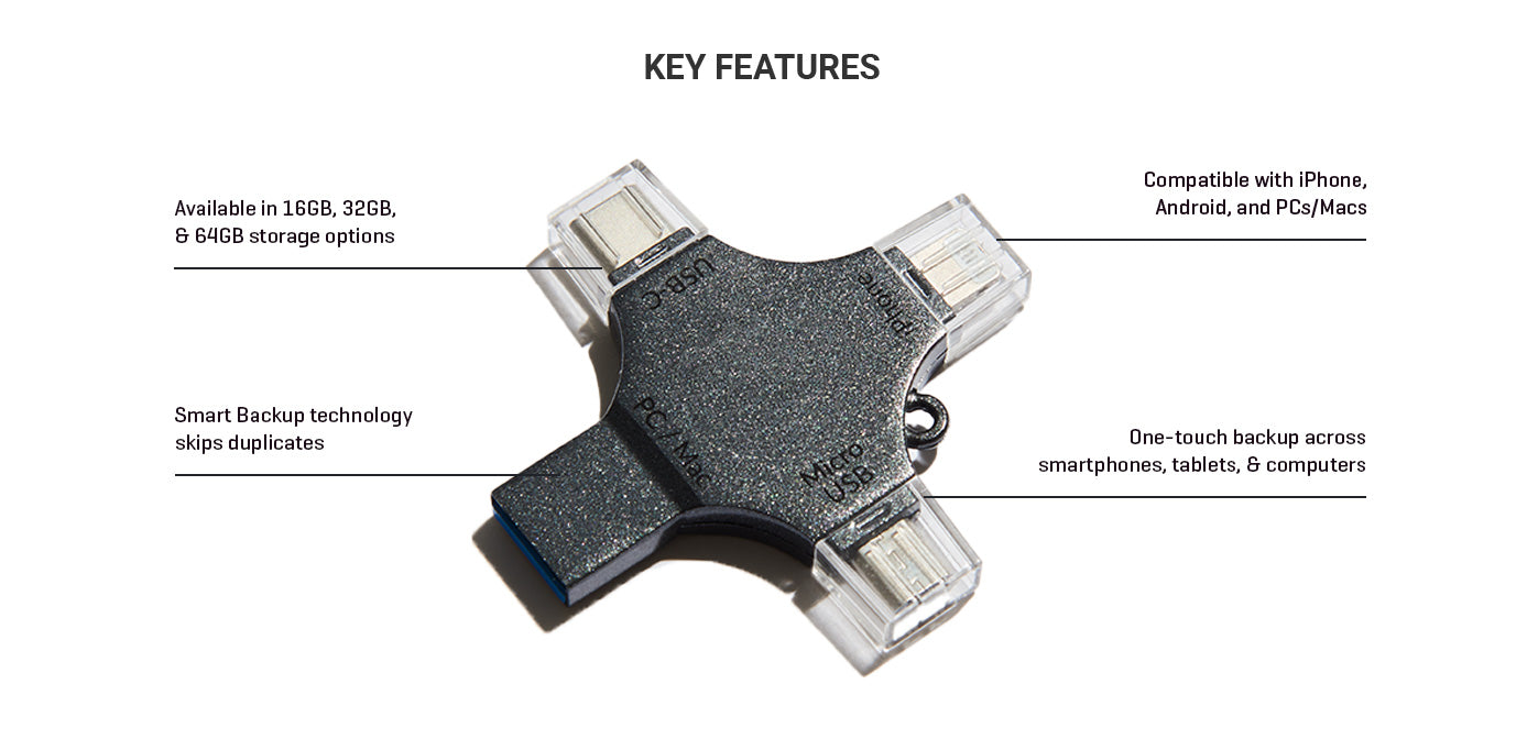 • USB-C, Micro USB, Lightning, and USB-A connectors