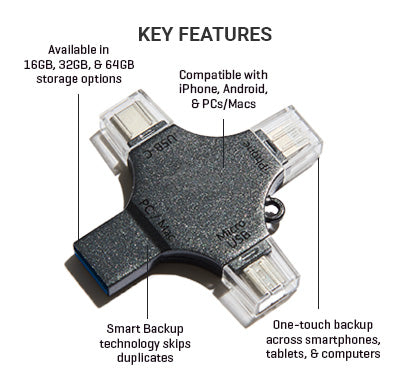 The Portable Smartphone Photo Vault is your go-to solution for freeing up space on your smartphone, tablet, or computer while securely backing up your memories. With its built-in connections for Lightning, USB-C, Micro USB, and USB-A, it offers seamless compatibility across all your devices. The device is available in 16GB, 32GB, and 64GB capacities, capable of storing up to 16,000 photos. Start your backup with a simple touch, and Smart Backup technology ensures it picks up where it last left off, saving time by skipping duplicates. Additionally, the newly updated app features exciting photo editing tools, allowing you to retouch, colorize, and even transform photos into Renaissance-style portraits or caricatures. The app is compatible with iPhone 6 and newer, Android OS 5.0 and later, as well as Windows and Mac computers, ensuring you never lose your most precious moments. Available in 16GB, 32GB, and 64GB storage options.
