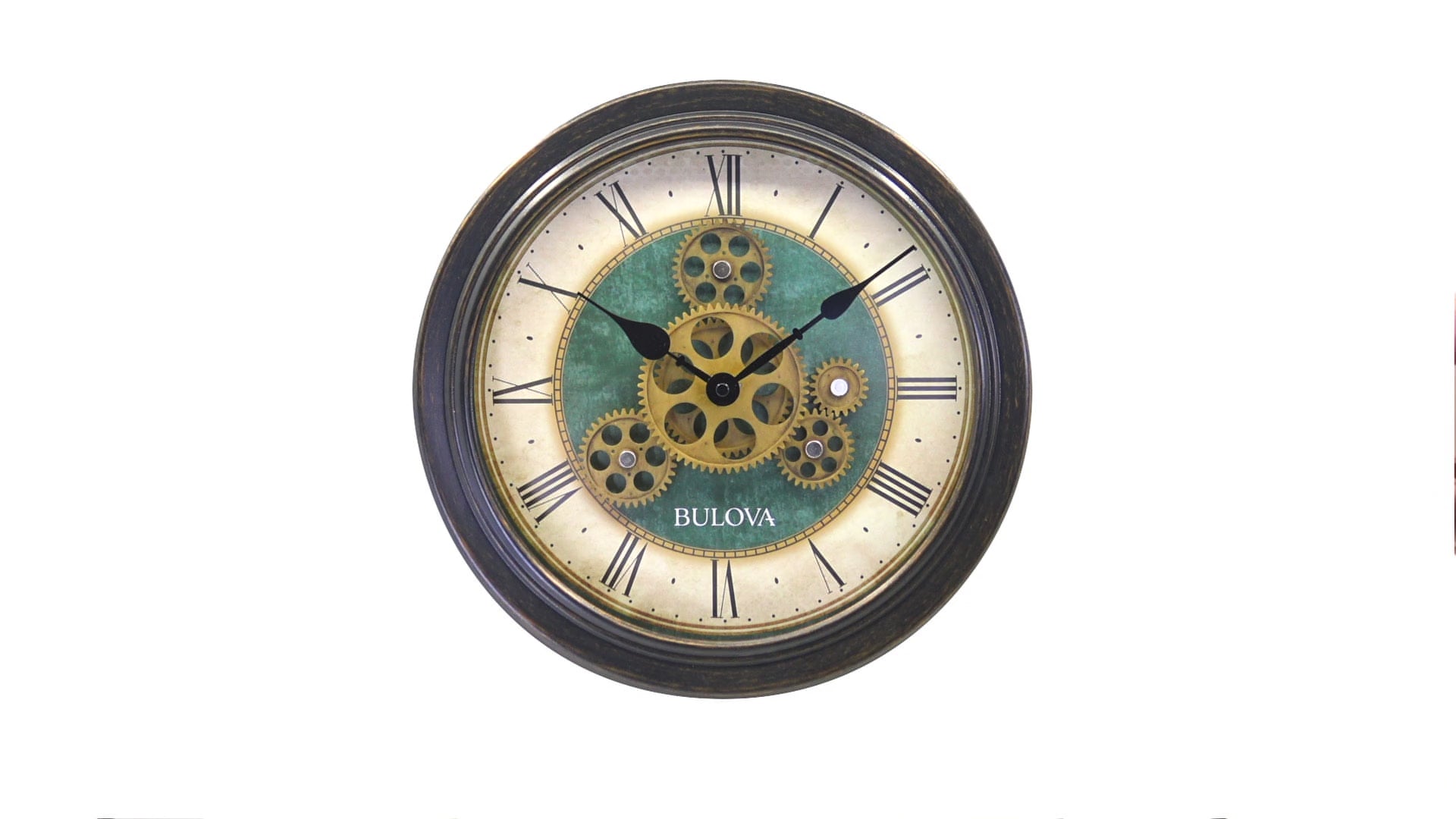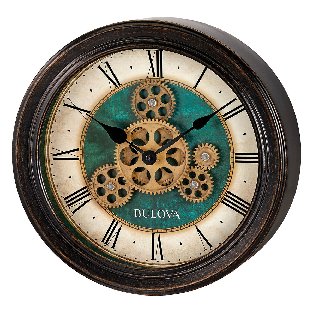Bring bold industrial character to your space with this striking Bulova wall clock. Bronze-finished rotating gears create mesmerizing motion and depth beneath a parchment-style dial accented by an aged green center. Traditional Roman numerals offer timeless appeal, while the aged black metal case enhances the vintage-meets-industrial aesthetic. Finished with a protective glass lens and powered by accurate quartz movement, this statement piece is perfect for modern lofts, offices, and living rooms.