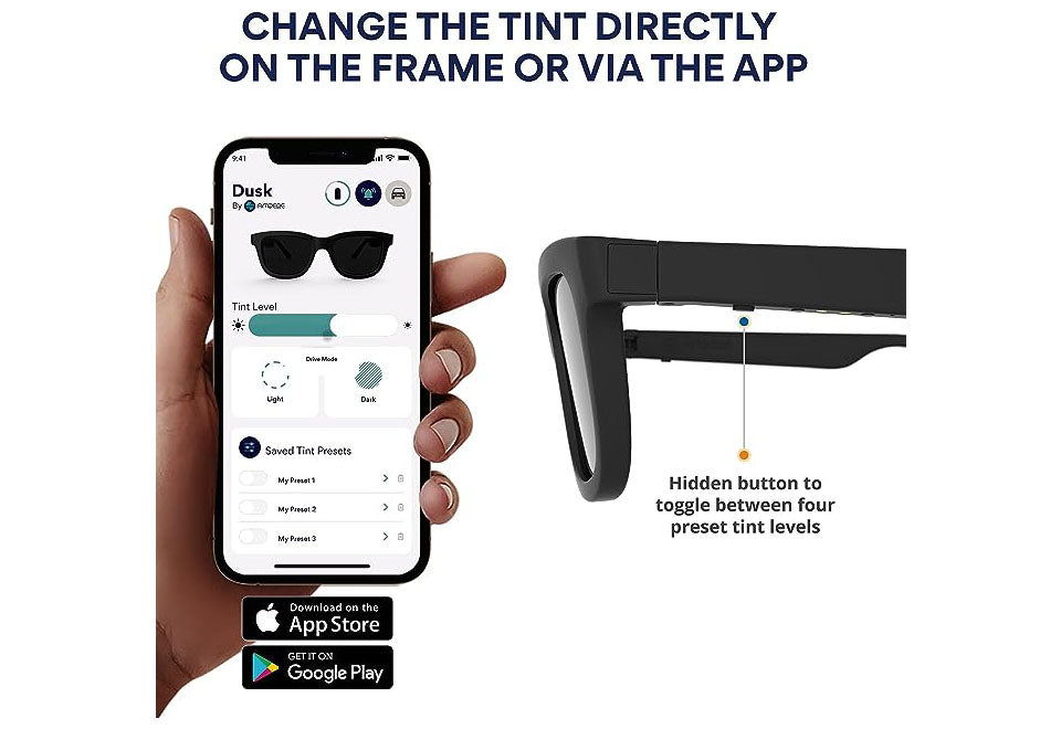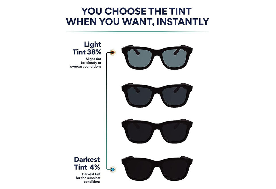 • Press a button on the frame or use the app to adjust the tint from gradual to dark in less than 1 second