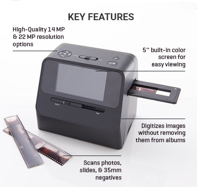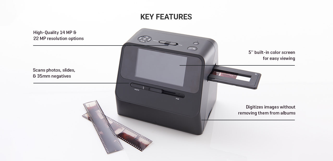 | Image Conversion: | Converts paper photos and images to JPEG format (up to 4"x6"), color and black-and-white negatives, and slides to JPEG format. |
