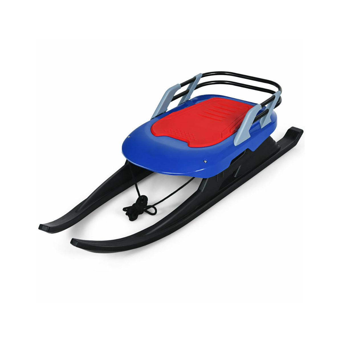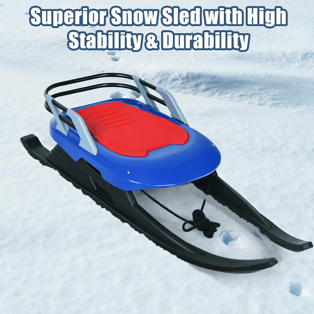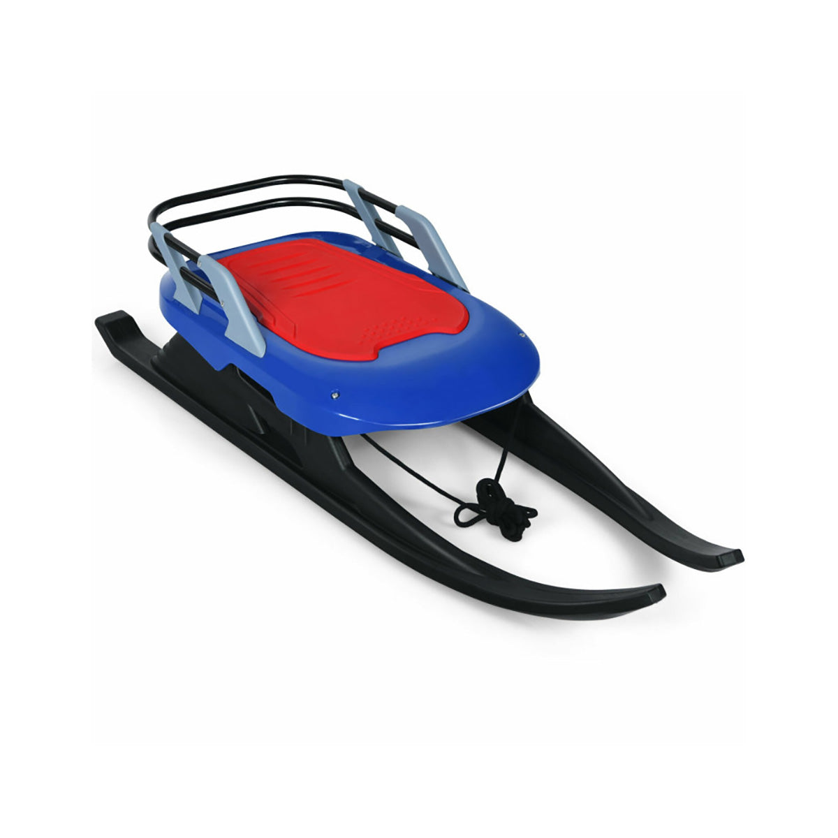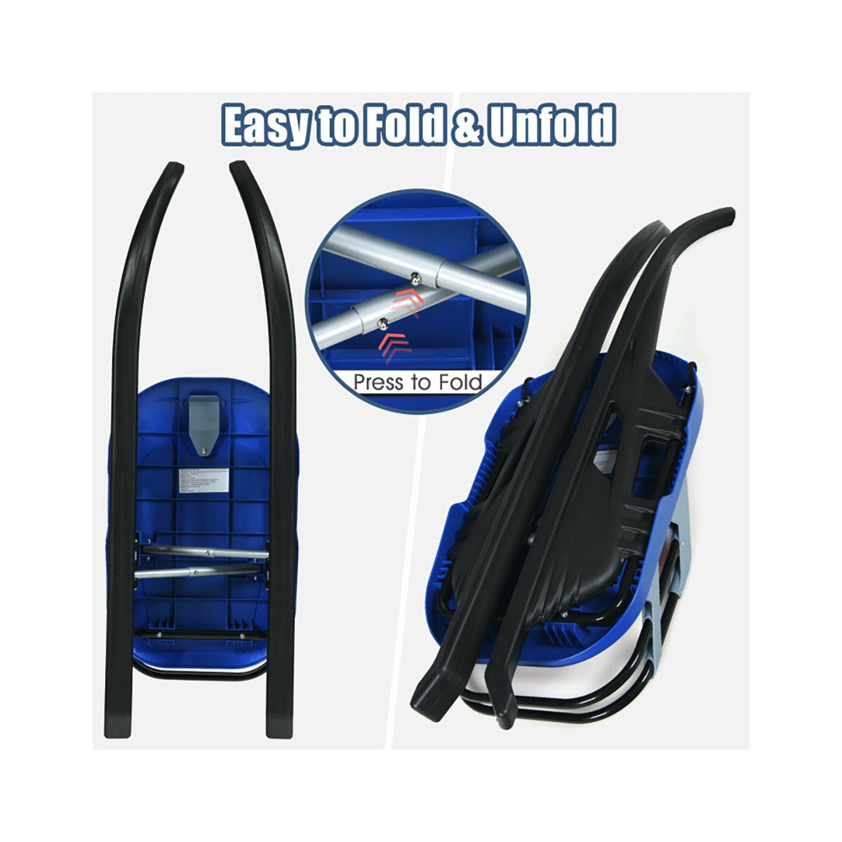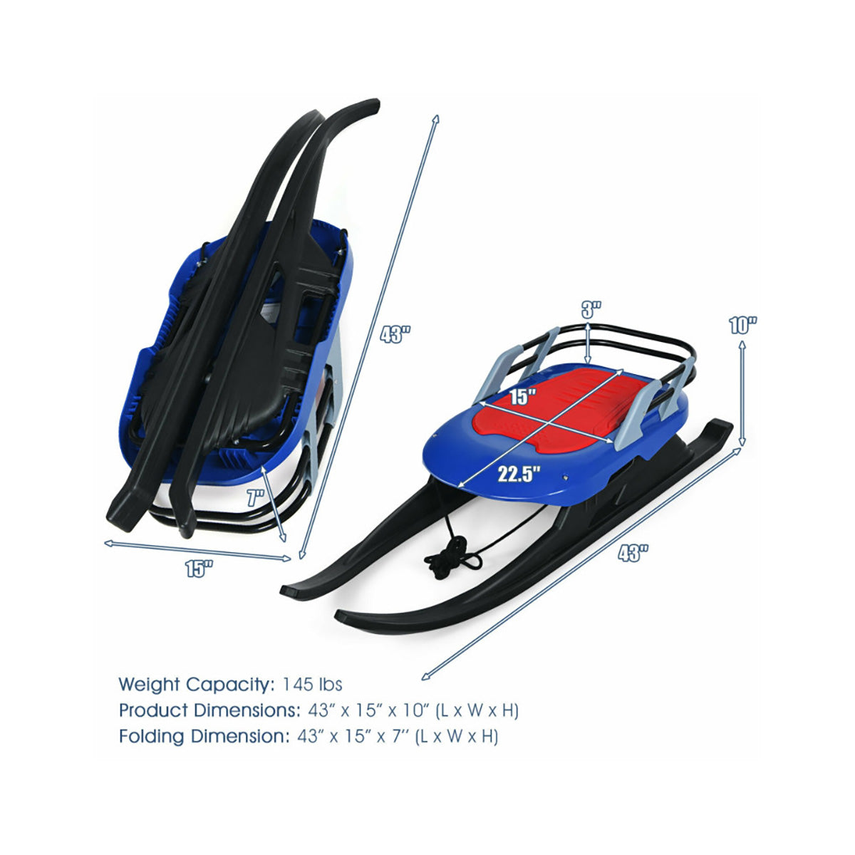 This Kids Folding Metal Snow Sled is built for winter fun, offering a durable design and smooth ride for outdoor adventures. Made from premium aluminum and iron, the sled withstands cold weather and freeze-thaw cycles without damage. Its high-strength plastic runners ensure a fast, smooth slide on snow, while the soft leather cushion with anti-skid texture provides comfort and safety. The foldable design allows for easy storage and transport, with side handles for carrying and a 105'' tow rope for convenient pulling.