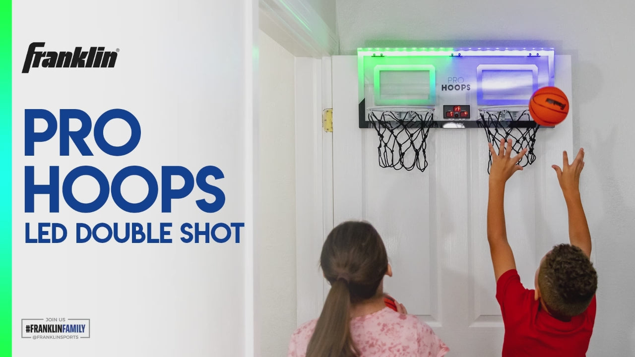 Bring the court to your room with this action-packed over-the-door basketball game. With two hoops and built-in LED scoring, you and a friend can go head-to-head in a thrilling shootout. The durable setup features a shatterproof backboard and spring-loaded steel rims, while foam-backed hooks protect your door.