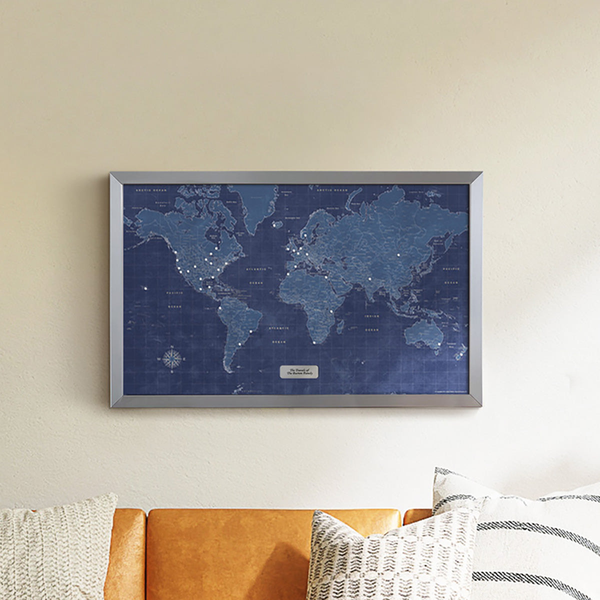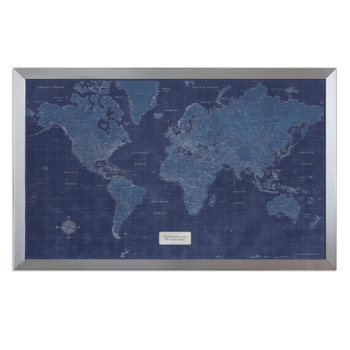 The Modern Blueprint World Travel Map blends striking design with meaningful storytelling. Its bold blueprint aesthetic highlights countries, major cities, and bucket-list destinations while offering a stylish, contemporary look for any space. Printed on heavy-duty archival paper and mounted on foam core, this high-quality map is built for a lifetime of travel memories. A sturdy silver metal frame and preinstalled hanging wire make display effortless. Use the included pins to trace your journeys, plan future adventures, and create a personalized visual journal of everywhere you’ve explored.