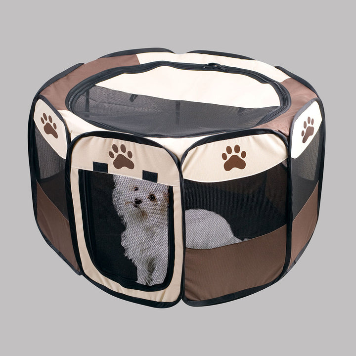 Create a safe, portable space for your pet indoors or outdoors. This lightweight play pen opens in seconds with no tools and folds flat for easy storage or travel. Breathable mesh/nylon walls, protected seams, and a sturdy metal frame provide airflow, visibility, and a den-like sense of security. A zippered roll-up door with Velcro tabs and a removable zippered shade cover add convenience. Water-resistant base helps contain messes. Available in Medium or Large, Beige or Black, with stake loops for outdoor stability. (700 characters or less)