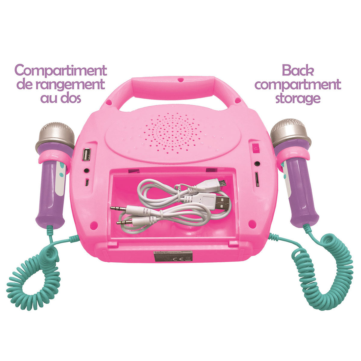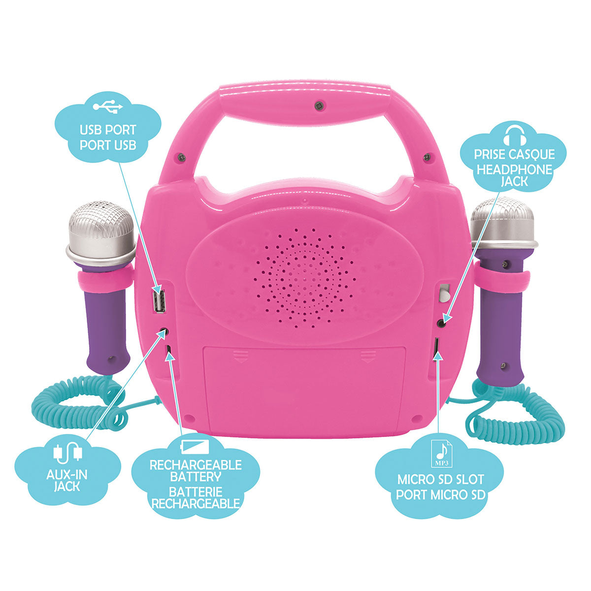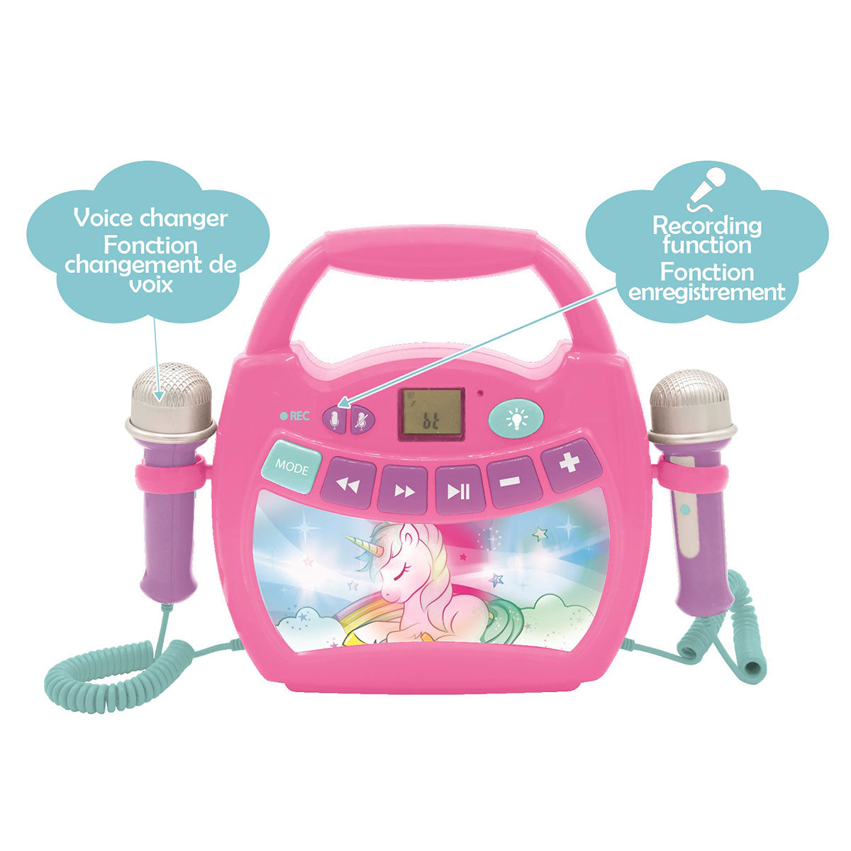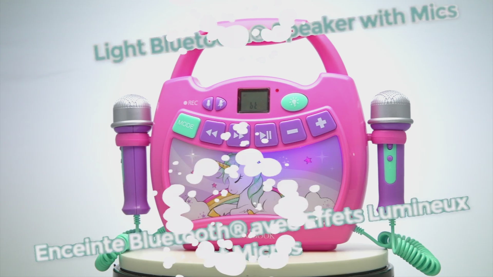 Make every karaoke moment magical with the Unicorn Bluetooth Speaker with Mics. This wireless karaoke player connects to your favorite Bluetooth® devices and features USB, TF/SD card, and Aux-In options for endless music playback. Two included microphones let friends sing duets, while flashing lights sync to the beat for a dazzling show. Add fun voice effects and record your best performances to replay later. With a convenient handle and lightweight design, this portable speaker is perfect for parties, sleepovers, or at-home concerts.