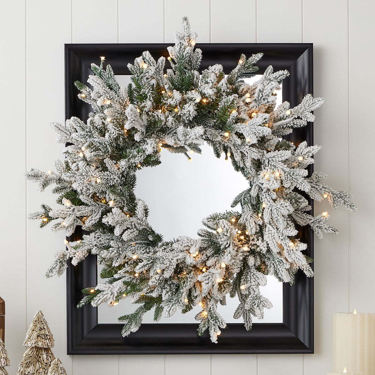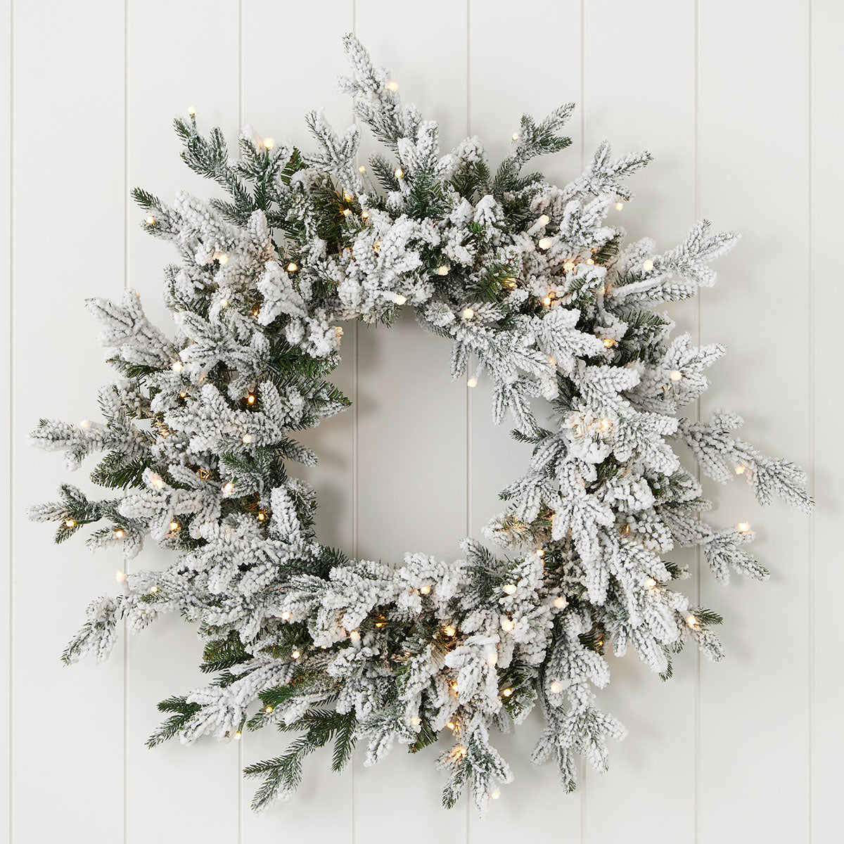 This snowy mixed-tip wreath features a specially designed flocking that maintains the look of freshly fallen snow while resisting shedding. Pre-strung with 150 warm white LED lights—more than most wreaths of its size—it creates a dazzling glow. Perfect for doors, walls, or windows, indoors or in covered outdoor spaces. The fire-resistant and non-allergenic design ensures safe, lasting seasonal beauty.