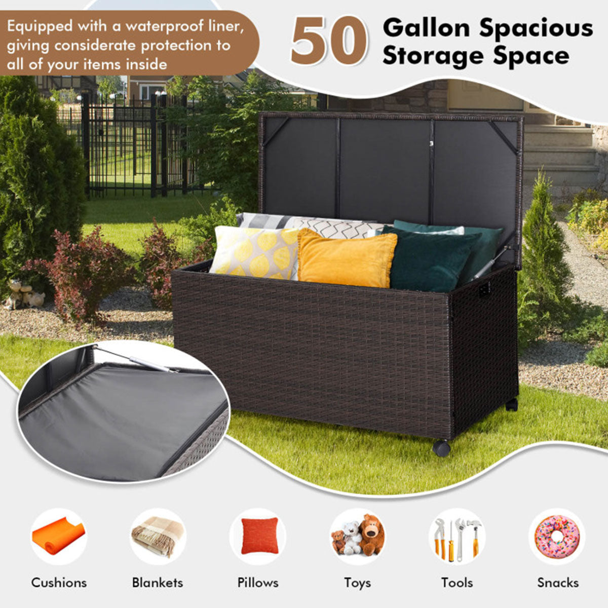 Maximize your outdoor storage with the stylish and versatile Outdoor Wicker Storage Box with Zippered Liner, available in 50 and 133 gallon sizes. This robust solution features a durable steel frame wrapped in weather-resistant PE rattan, complete with a waterproof PU-coated liner. The functional pneumatic rods ensure safe and slow lid movement, while the mobile design with wheels and handles makes relocation effortless. Ideal for storing cushions, tools, and more, doubling as a chic patio side table.