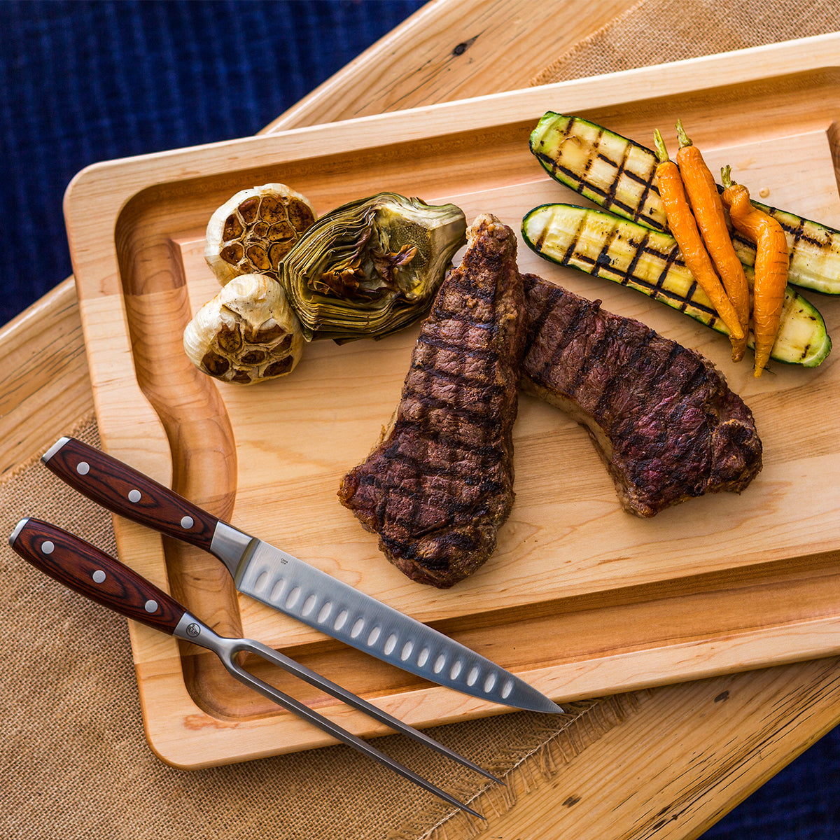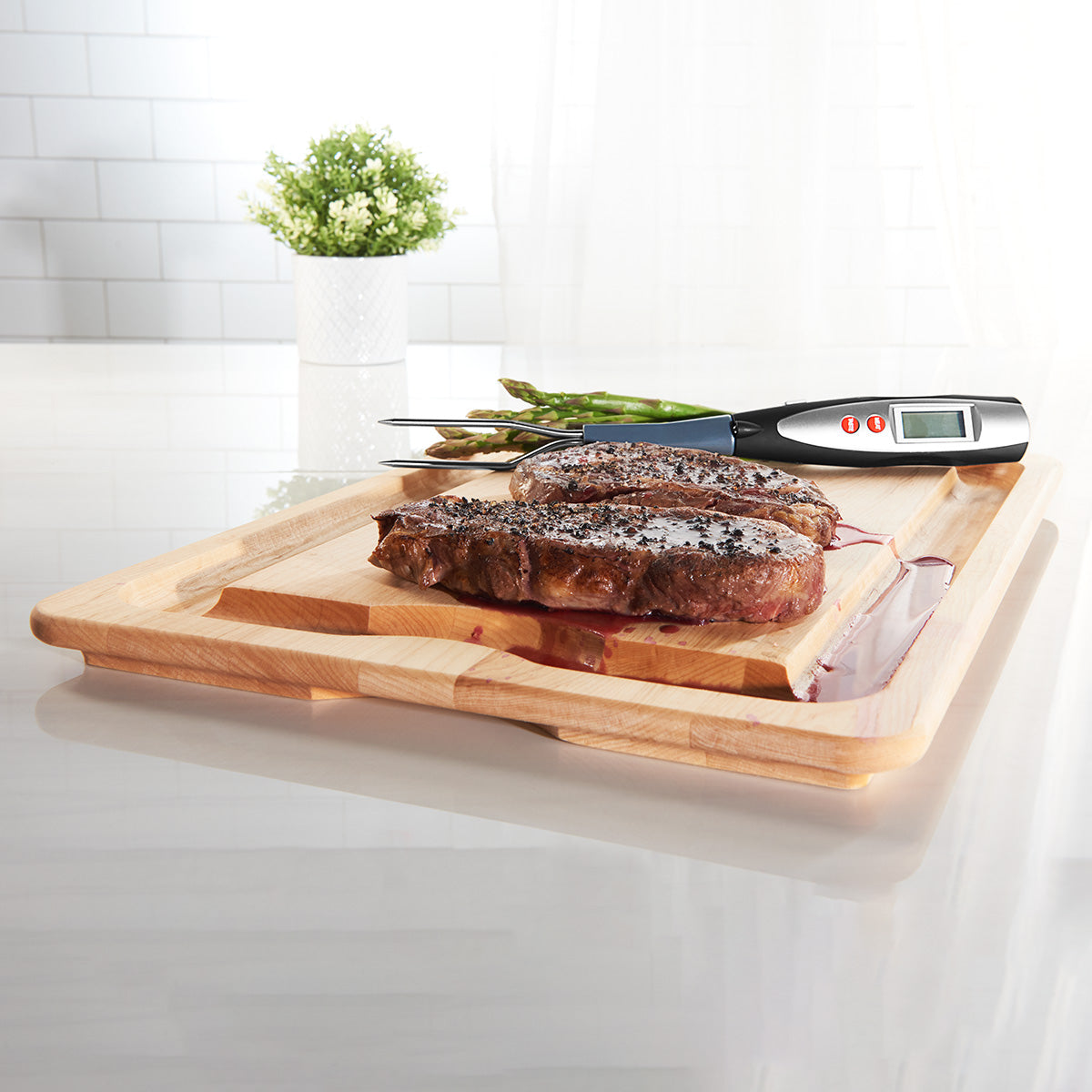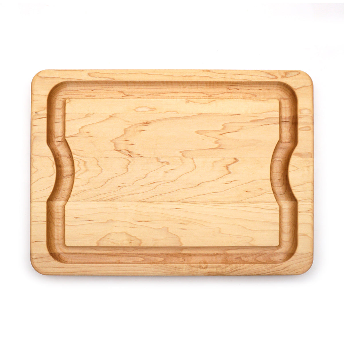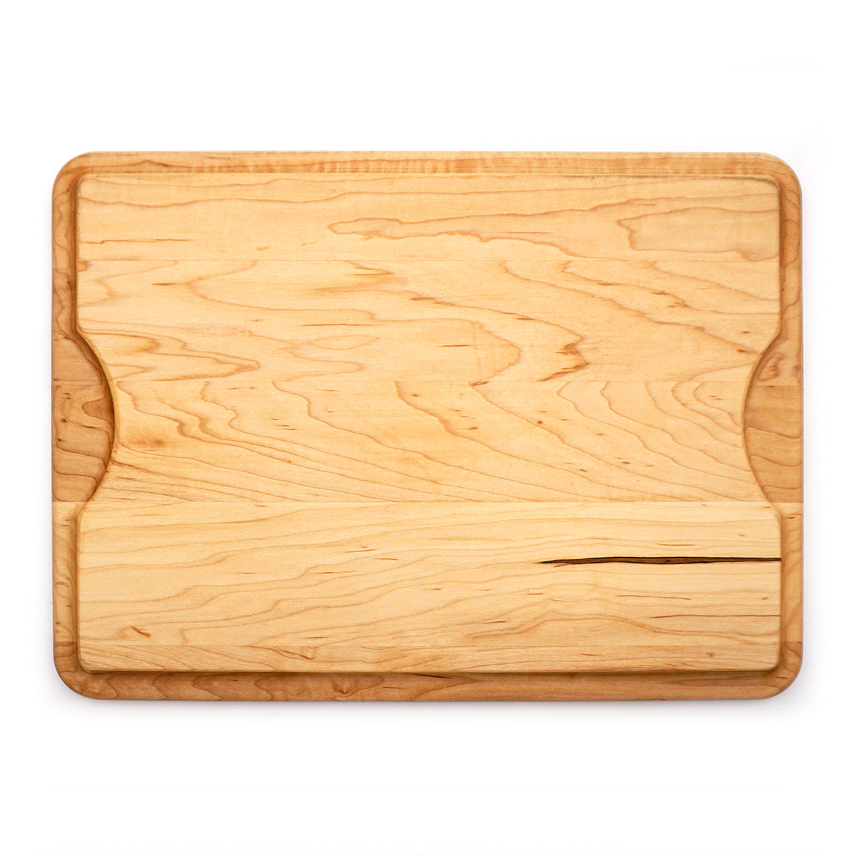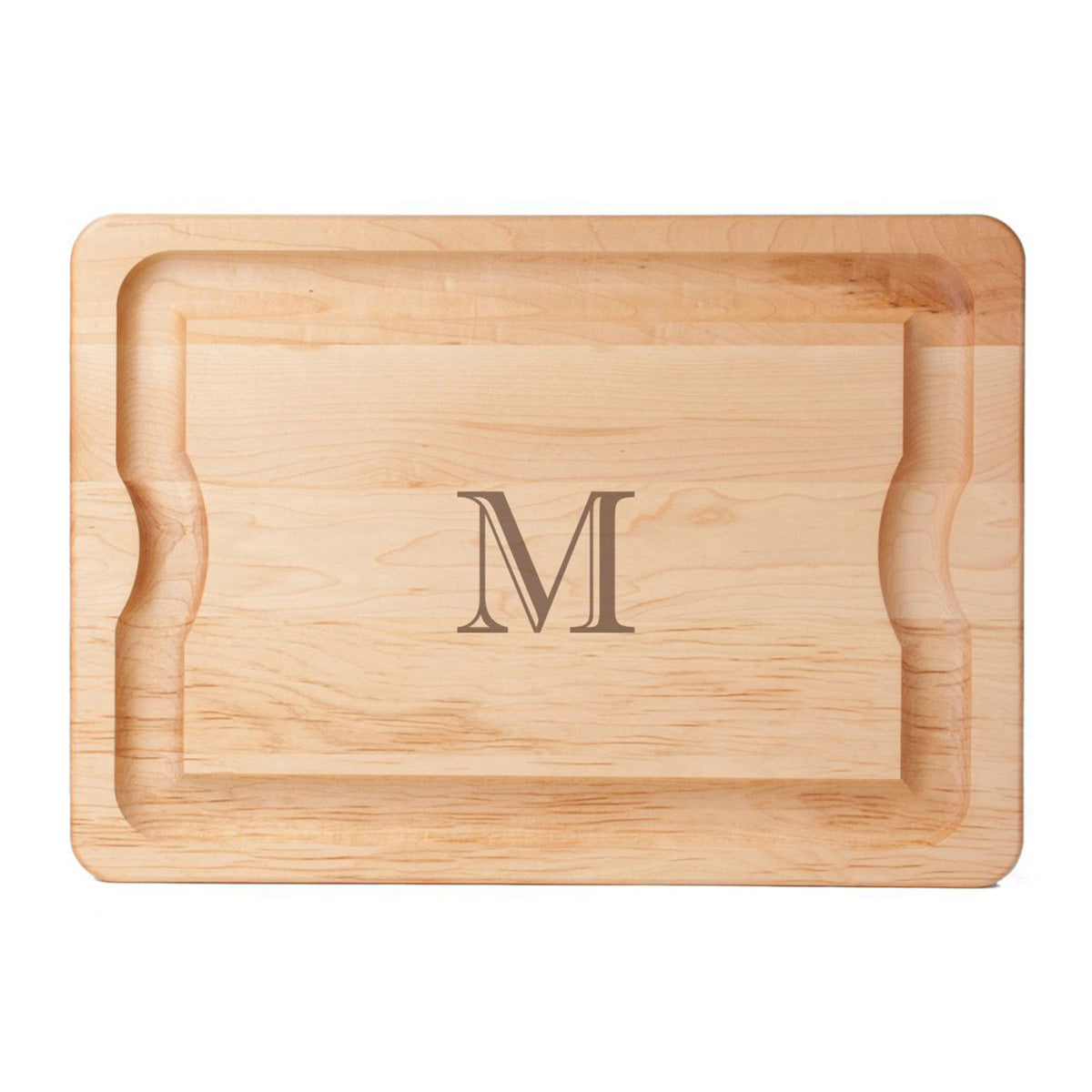 The Personalized Maple BBQ Carving Board is a durable and elegant essential for any BBQ lover. Available in three sizes—16'' x 12'', 20'' x 14'', and 24'' x 16''—it is perfect for carving anything from grilled steaks to fall-off-the-bone ribs. This USA-made board is crafted from sustainably harvested North American maple and finished with food-safe mineral oil and beeswax. The undercut handles allow for easy transport, while the juice groove collects liquids, making cleanup a breeze. What sets this board apart is the option to personalize it with a finely laser-engraved 4'' initial, centered perfectly to make your BBQ or family gathering even more special. With its quality craftsmanship and functional design, this carving board offers both practicality and style for all your culinary needs.