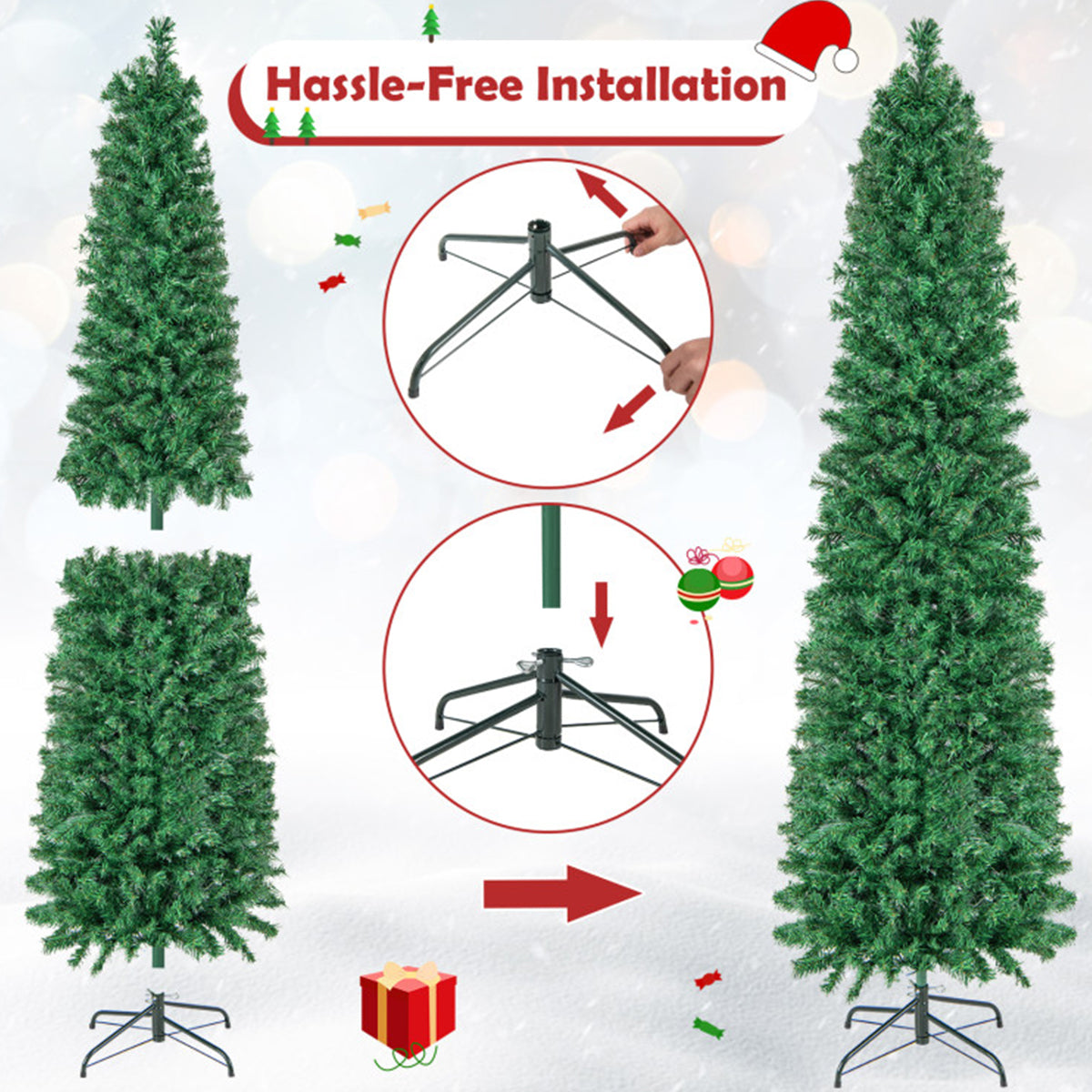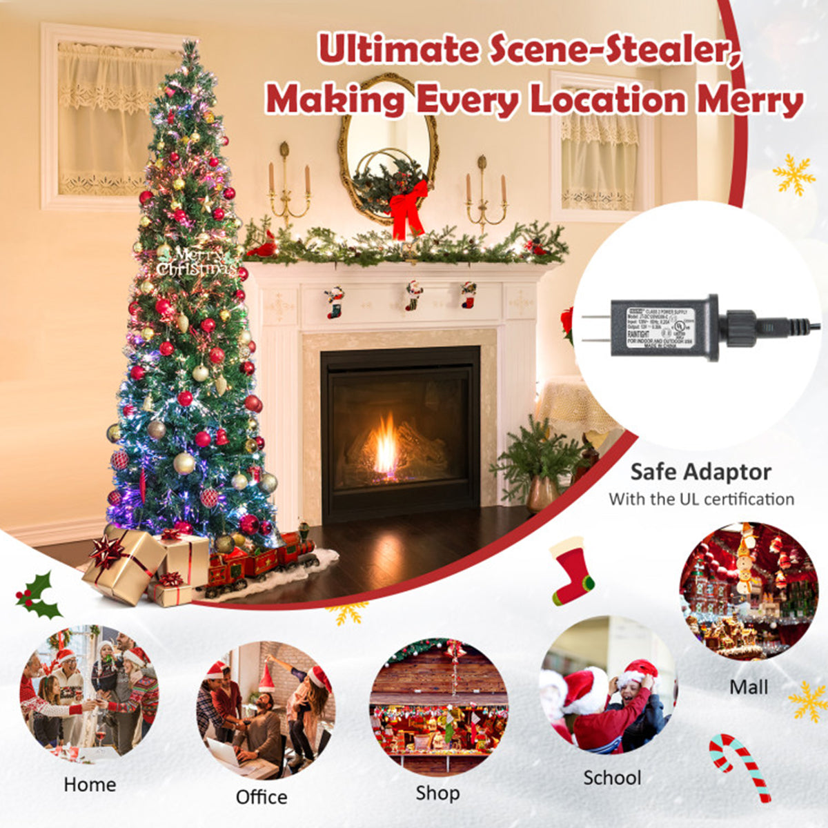 Enhance your holiday decor with the 7' Pre-lit Artificial Pencil Christmas Tree with Fiber Optics. This slim, space-saving tree features 697 lush branch tips that create a vibrant, full look without taking up much space. The fiber optic lighting system emits colorful, magical lights, perfect for creating an inviting holiday ambiance. Crafted from premium, fire-resistant, and non-allergenic PVC, this tree is built for durability and safe use. Its slim pencil design fits snugly into corners or compact spaces, making it ideal for smaller rooms or offices. Quick and easy assembly with a folding metal stand means you can set up your tree in no time and enjoy the festive season without any hassle.