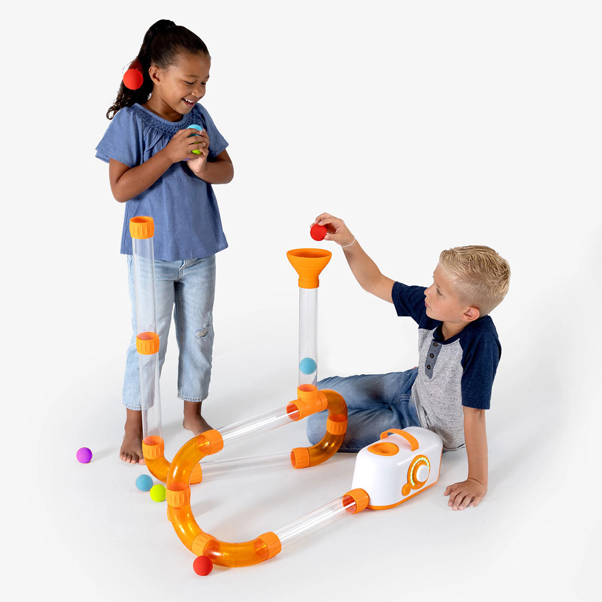 Unleash your child's imagination with Air Toobz, the customizable toy that blends play with STEM learning. It encourages spatial reasoning and problem-solving through a network of tubes that come alive with a kid-safe turbine. Balls fly, hover, and whirl, powered by adjustable airflow for interactive fun. Durable, with a rechargeable battery and auto shut-off, this set sparks hours of creative play and is easy to pack away with its carrying case.
