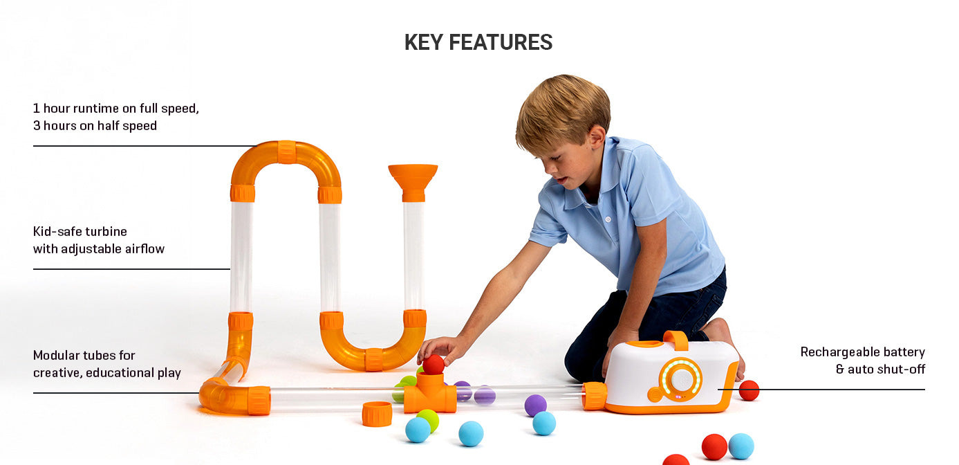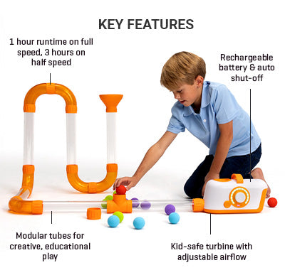 Unleash your child's imagination with Air Toobz, the customizable toy that blends play with STEM learning. It encourages spatial reasoning and problem-solving through a network of tubes that come alive with a kid-safe turbine. Balls fly, hover, and whirl, powered by adjustable airflow for interactive fun. Durable, with a rechargeable battery and auto shut-off, this set sparks hours of creative play and is easy to pack away with its carrying case.
