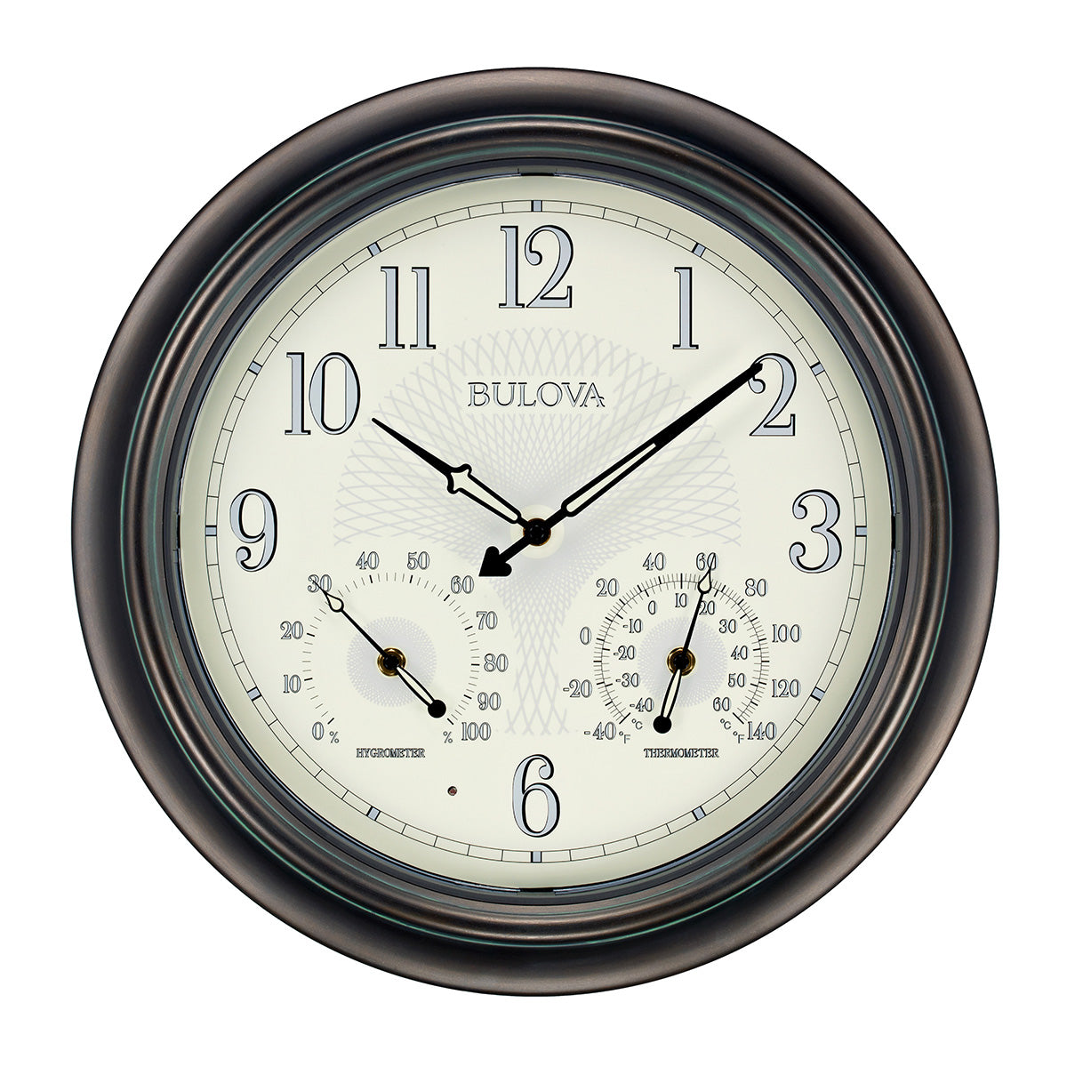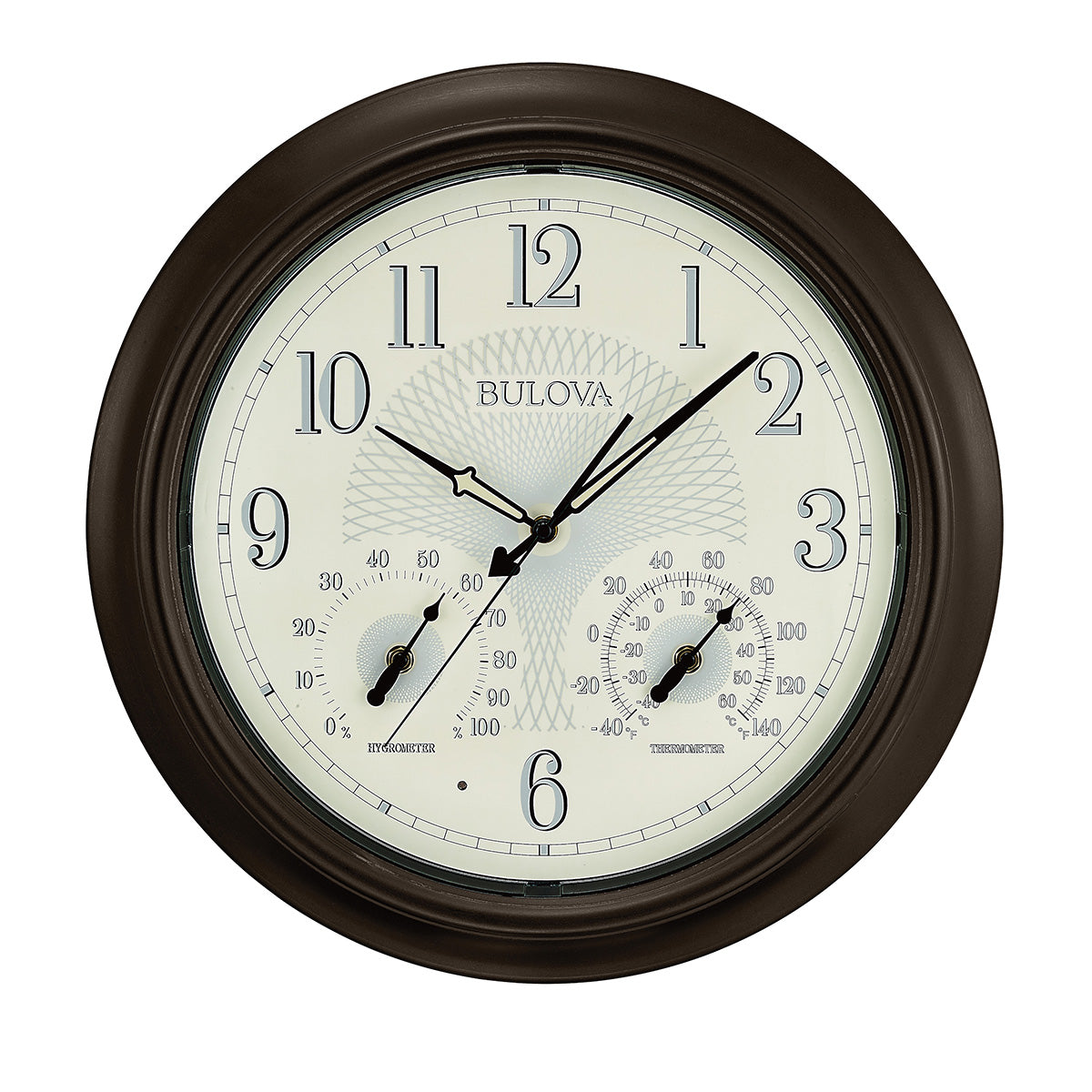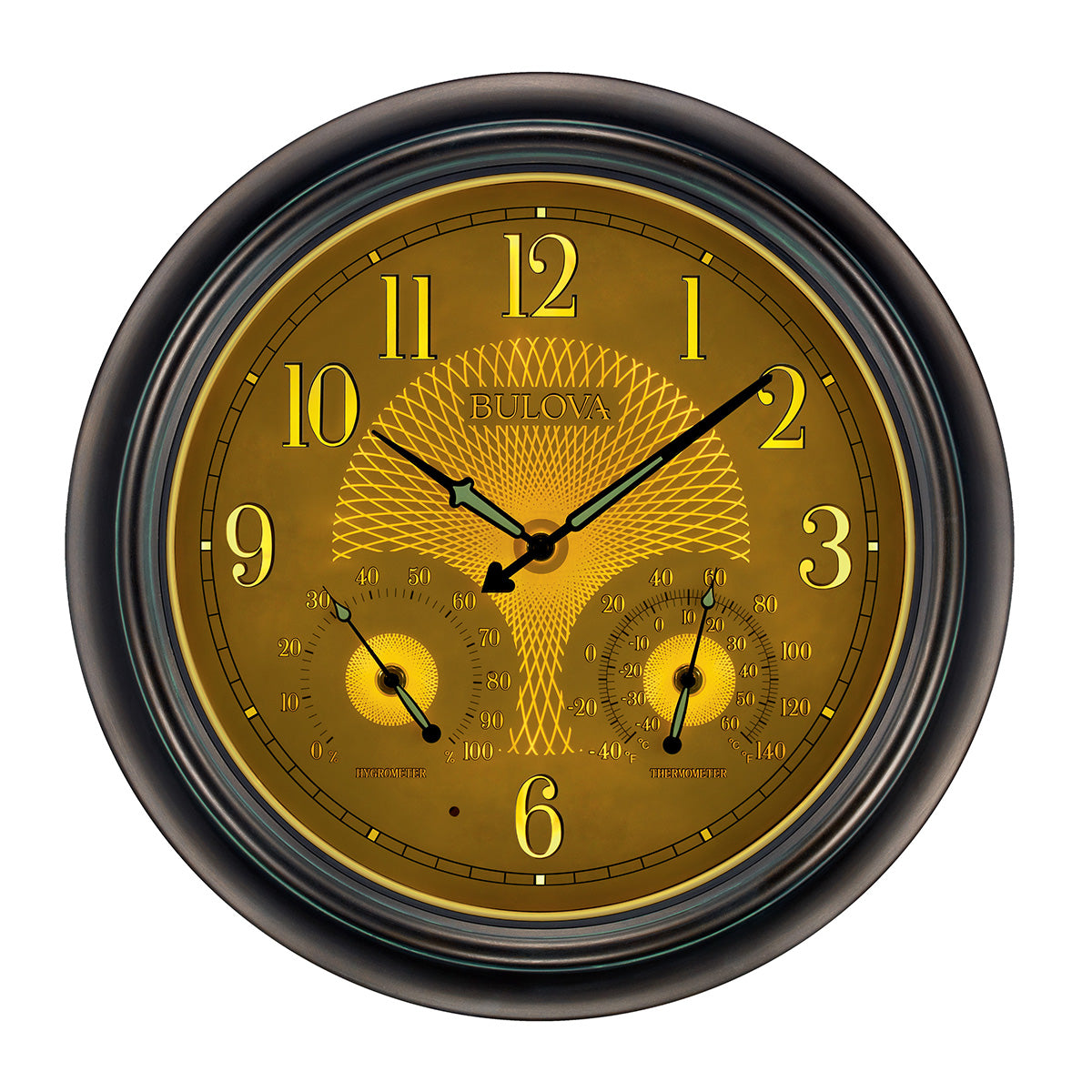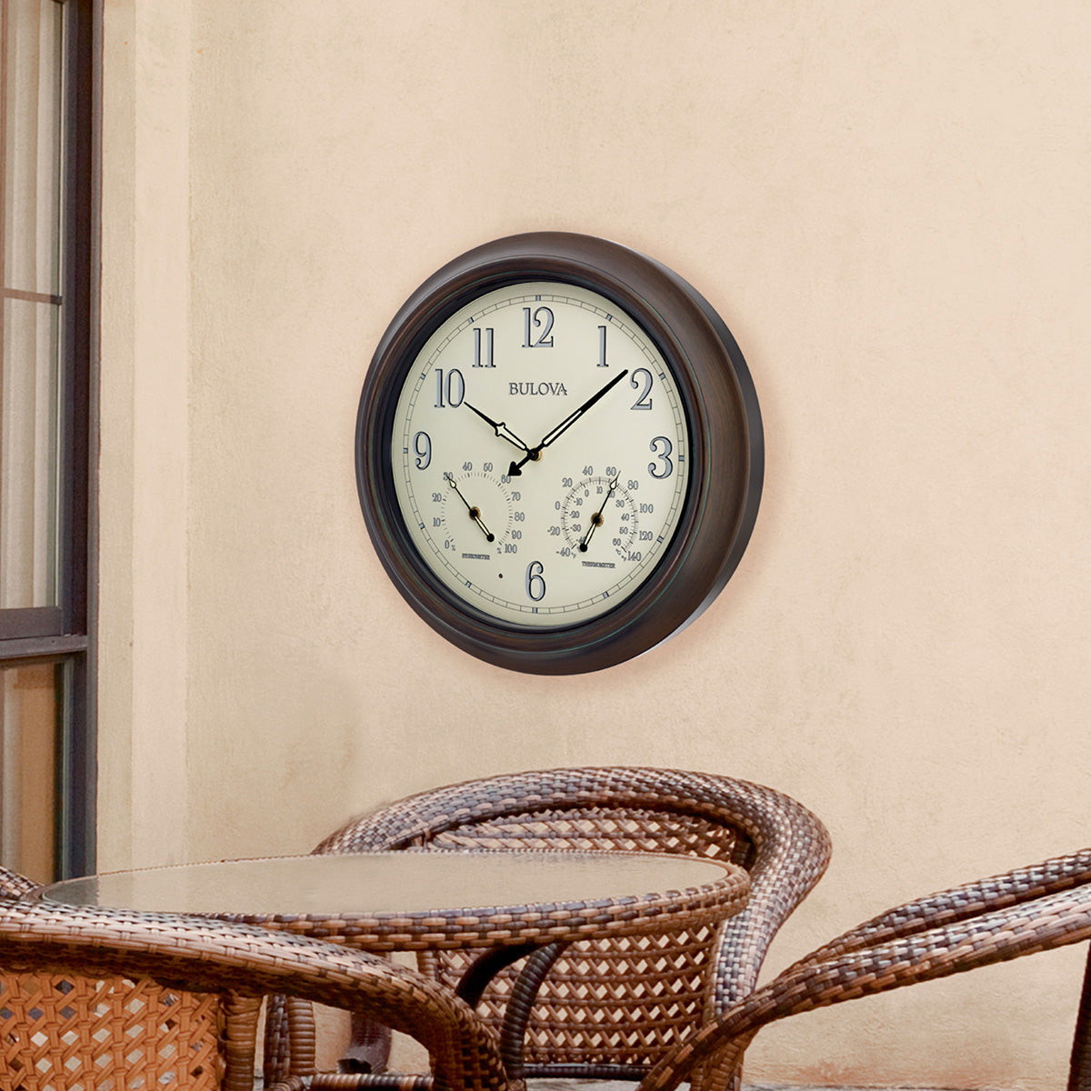 Enhance your outdoor space with the durable and stylish Bulova Weather Master Outdoor LED Wall Clock. Featuring a burnished bronze two-step metal case and a weatherproof gasketed design, this clock is built to withstand the elements. The light-responsive LEDs automatically illuminate the reflective dial at dusk for nighttime visibility and turn off at dawn. Adjustable instruments allow for fine-tuning to local conditions, and a silent sweep seconds hand ensures quiet operation. With an upgraded heat-resistant quartz movement, this clock maintains accurate time even in high temperatures, making it perfect for any outdoor environment.