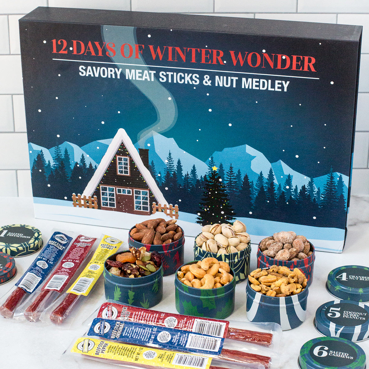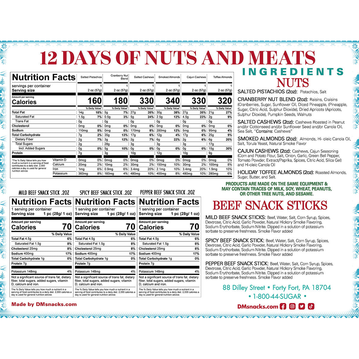 Indulge in the ultimate holiday snacking experience with the Damn, Man 12 Days of Gourmet Nuts and Meats Advent Calendar. This curated selection features six gourmet nut medleys and six flavorful meat sticks, offering a savory treat every day for 12 days. From Holiday Toffee Almonds to Cajun Cashews and Original Meat Sticks, each bite delivers a burst of flavor. Perfect for gifting, entertaining, or enjoying yourself, this advent calendar adds a delicious twist to the holiday season. Ideal for anyone who loves the combination of nuts and meats, this set is the ultimate holiday snack indulgence.