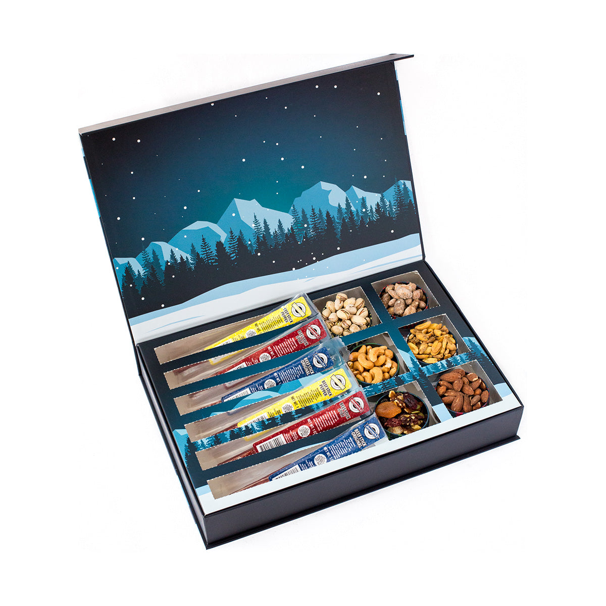- 12 delicious snacks: 6 gourmet nut blends and 6 meat sticks