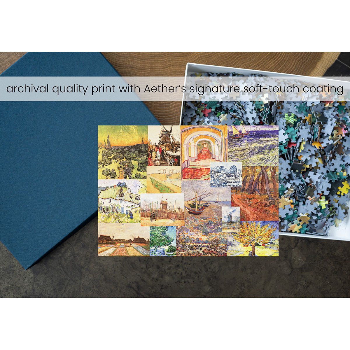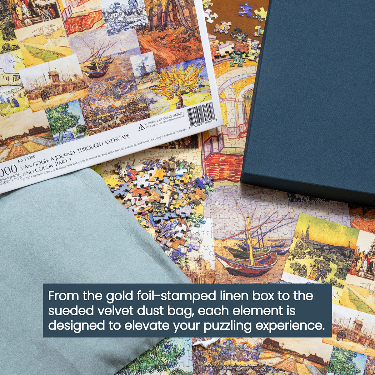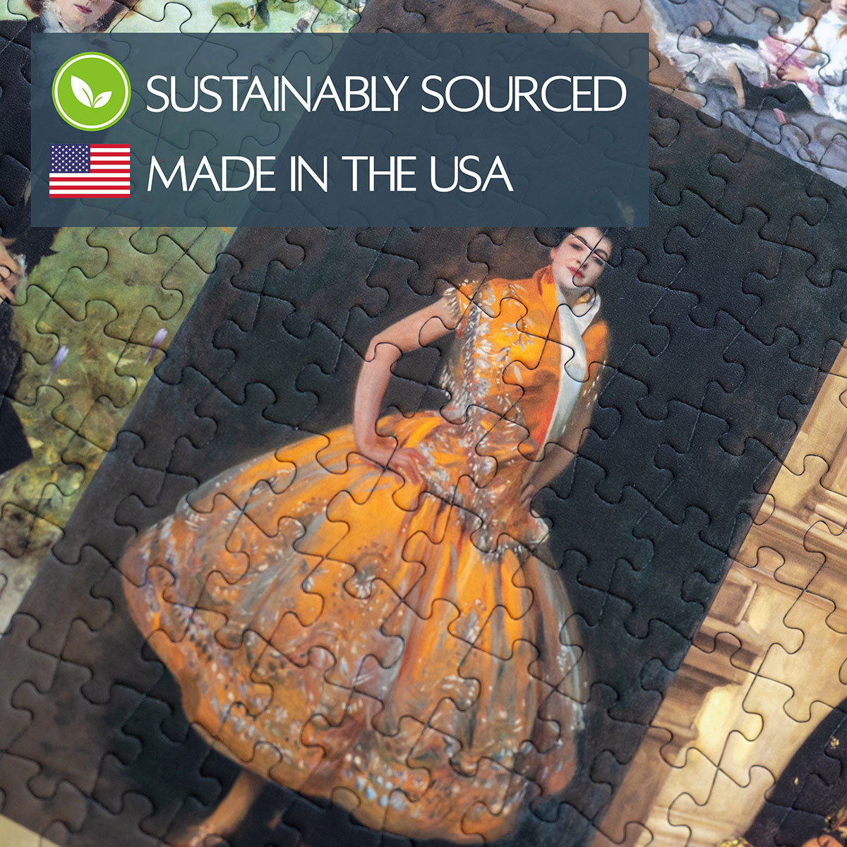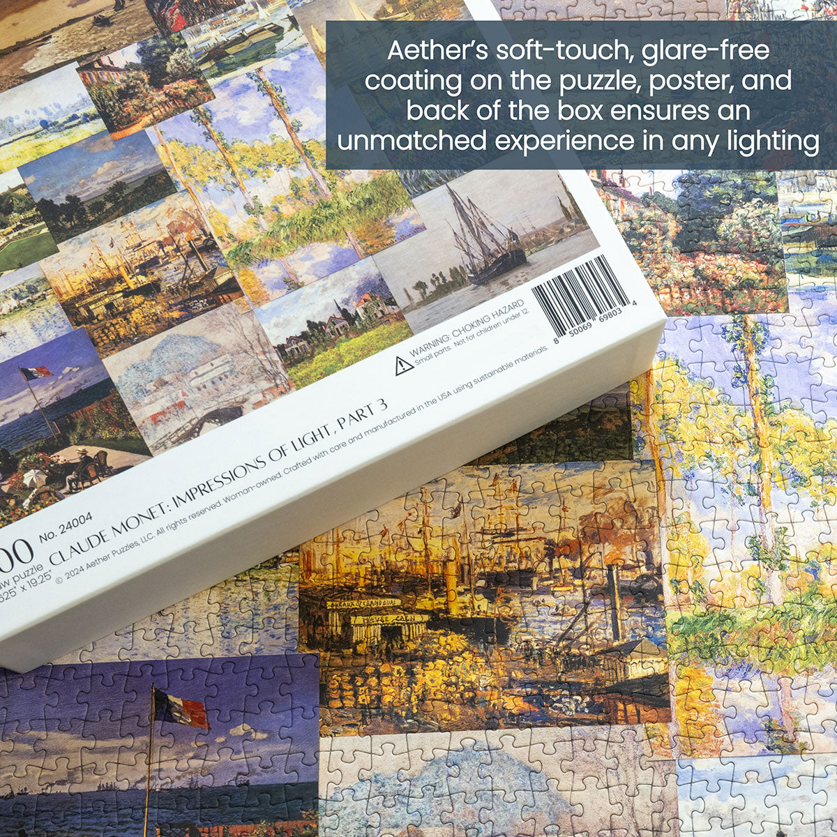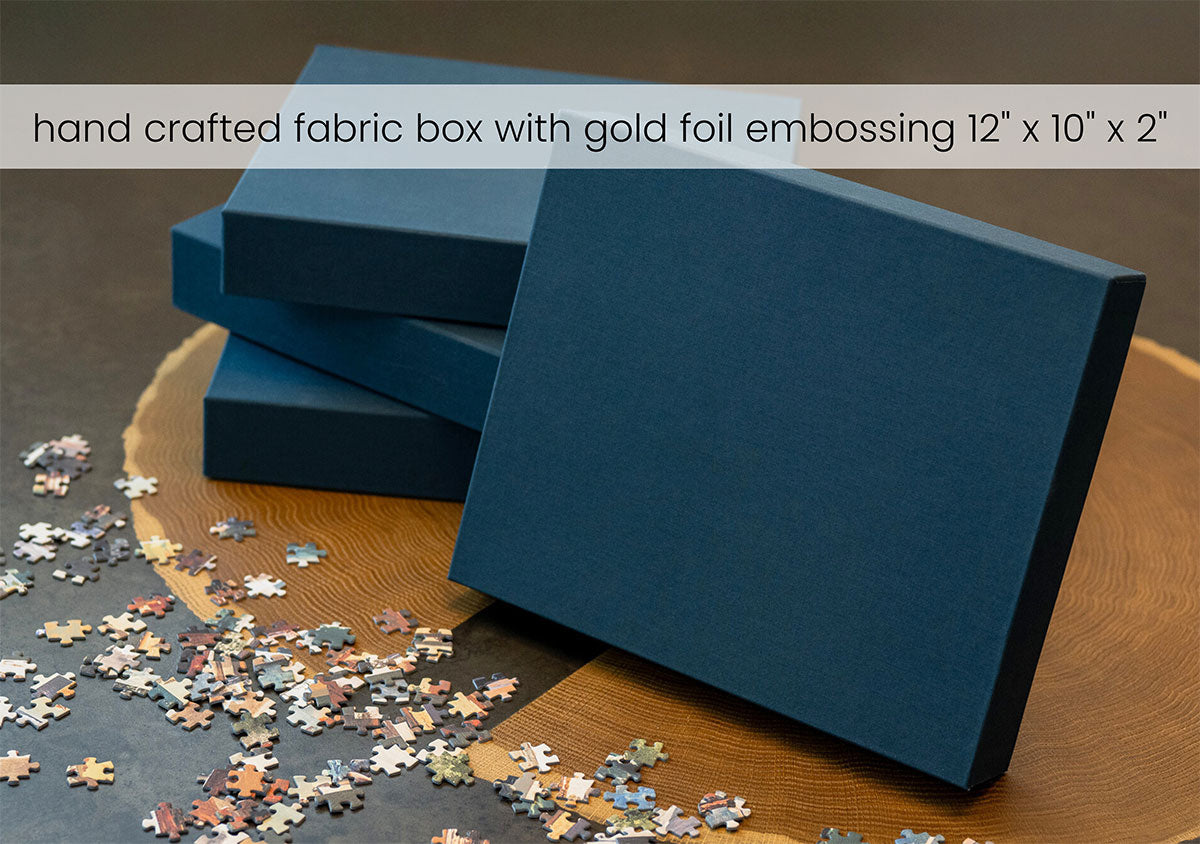 Piece together masterpieces with this collection of 14 museum-quality 1000-piece puzzles that celebrate the greats—from Impressionist light studies to bold post-Impressionist color and masterful portraiture. Each puzzle is cut from thicker durable board and finished with a soft-touch, glare-free coating so details and brushwork read clearly under any light. Packaged in an elegant textured box with a velvet bag and finished art placard, these puzzles elevate puzzling into an artful experience.