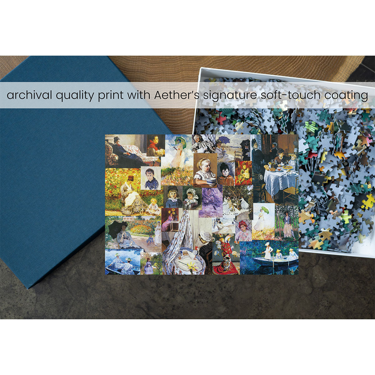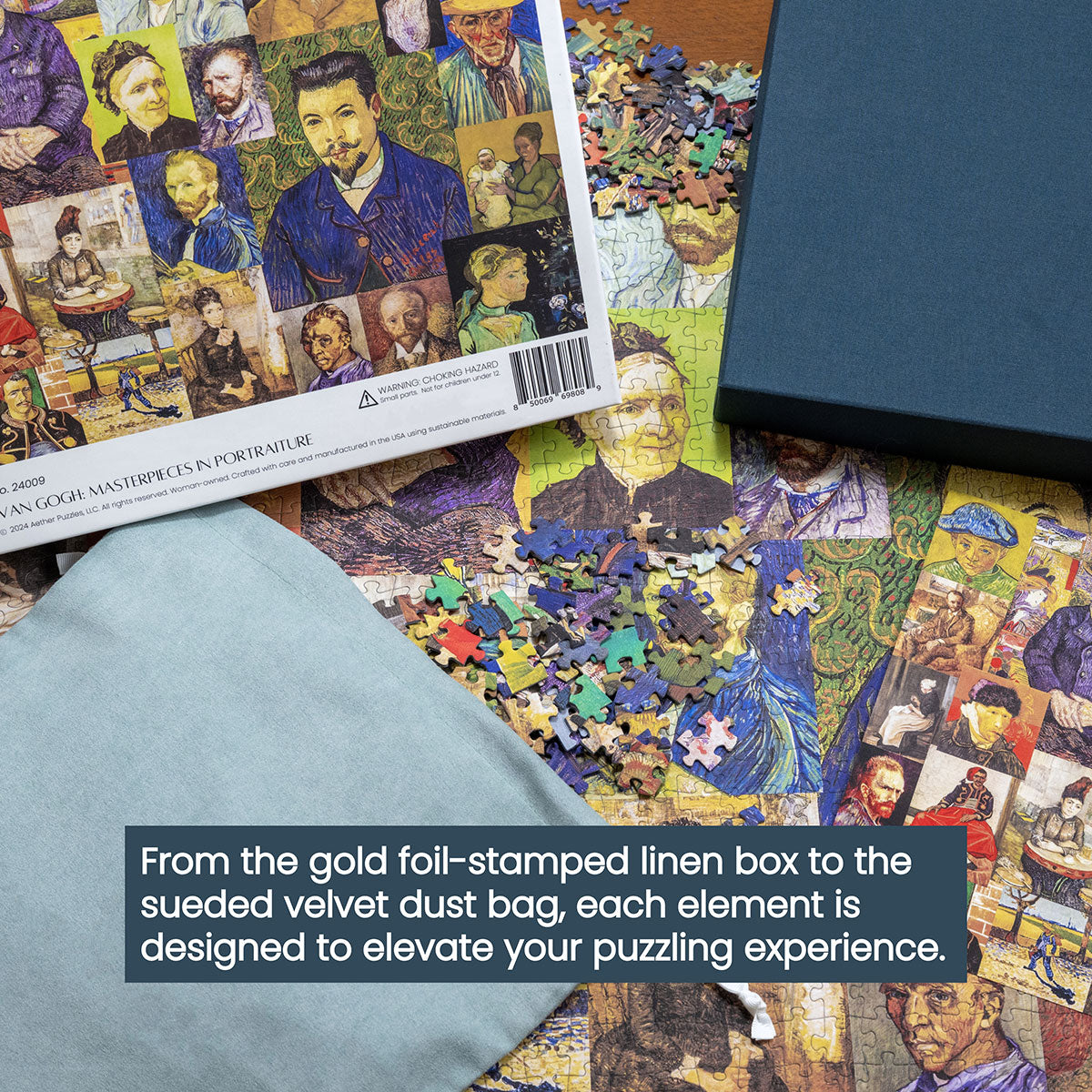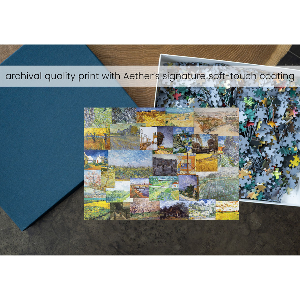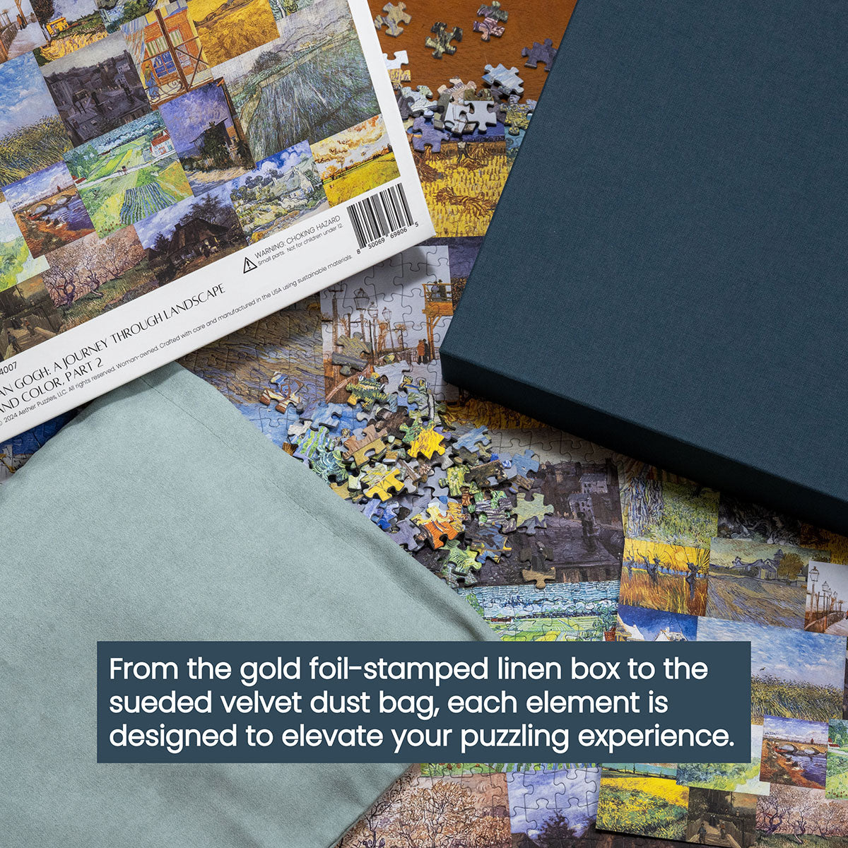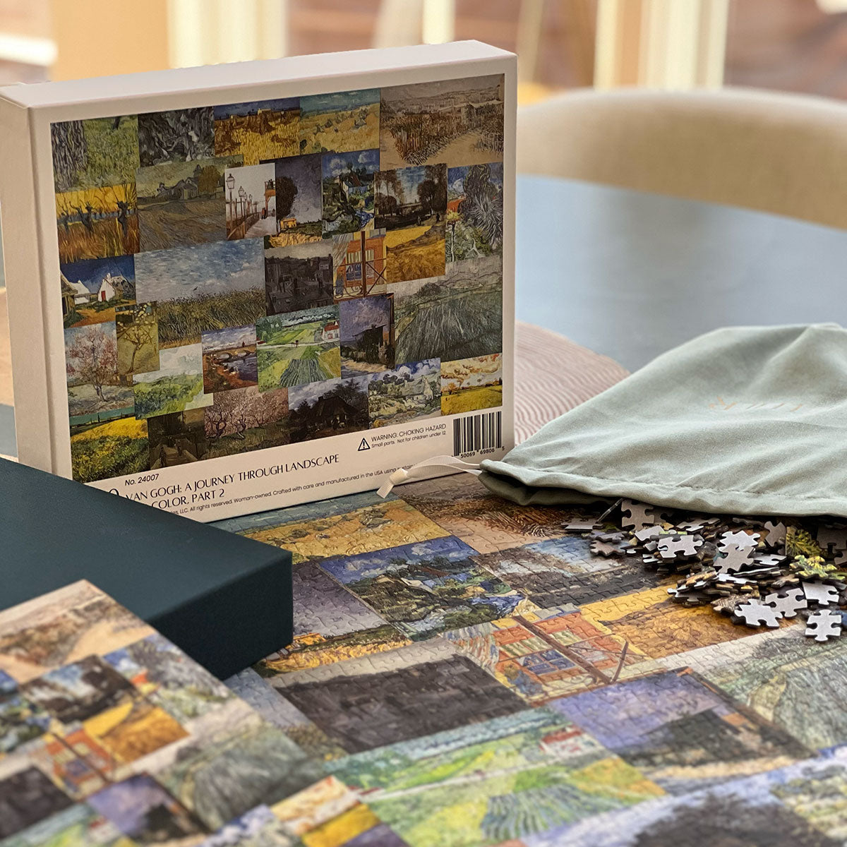 Piece together masterpieces with this collection of 14 museum-quality 1000-piece puzzles that celebrate the greats—from Impressionist light studies to bold post-Impressionist color and masterful portraiture. Each puzzle is cut from thicker durable board and finished with a soft-touch, glare-free coating so details and brushwork read clearly under any light. Packaged in an elegant textured box with a velvet bag and finished art placard, these puzzles elevate puzzling into an artful experience.