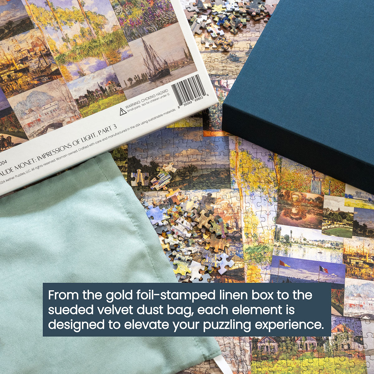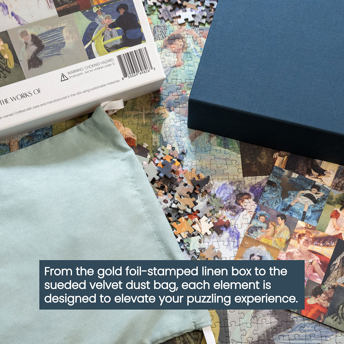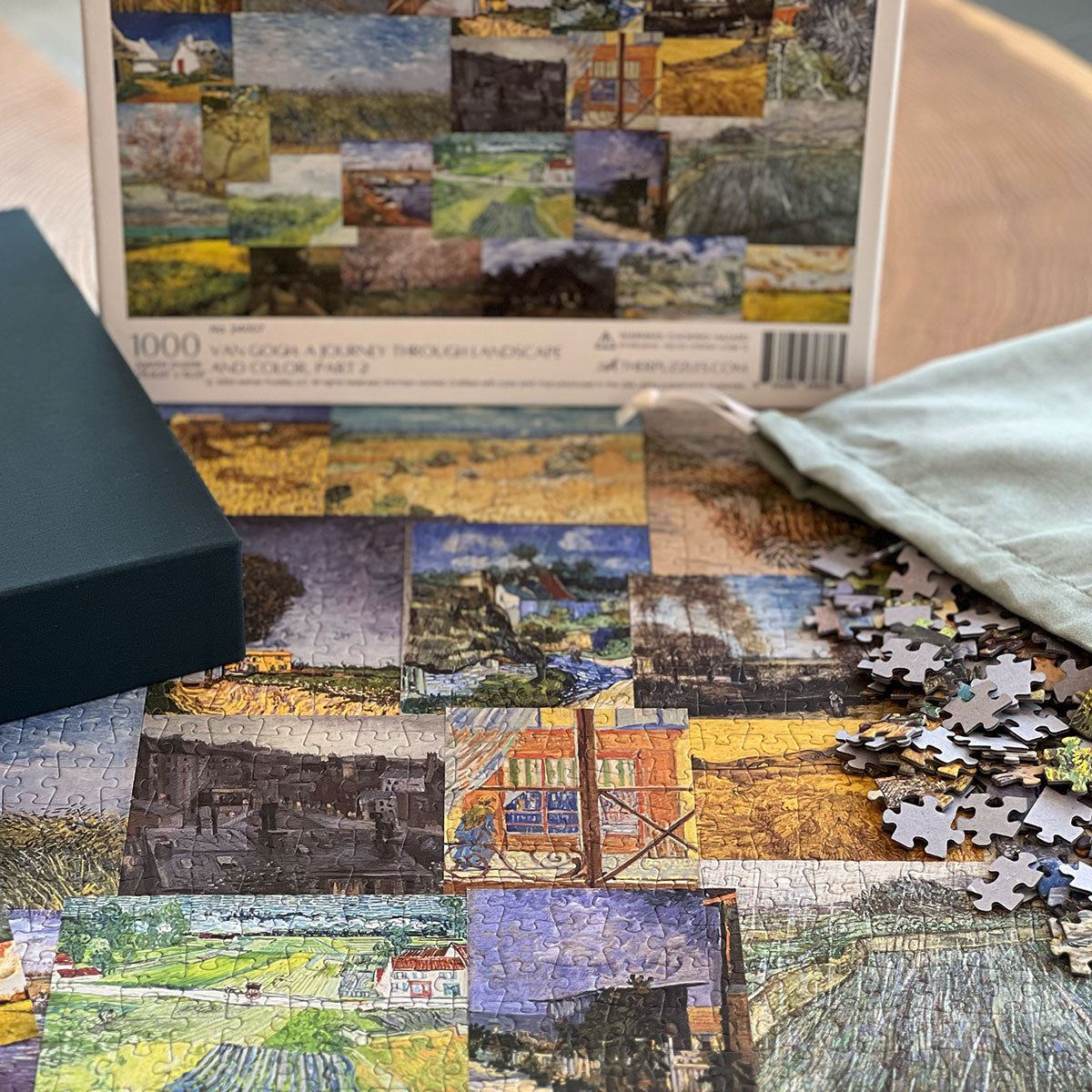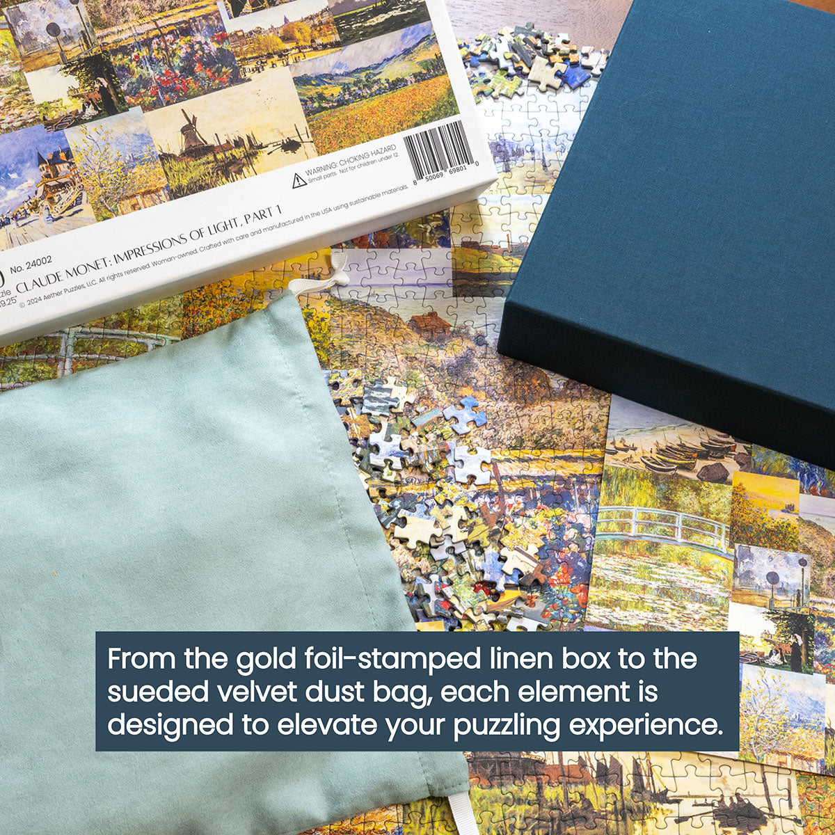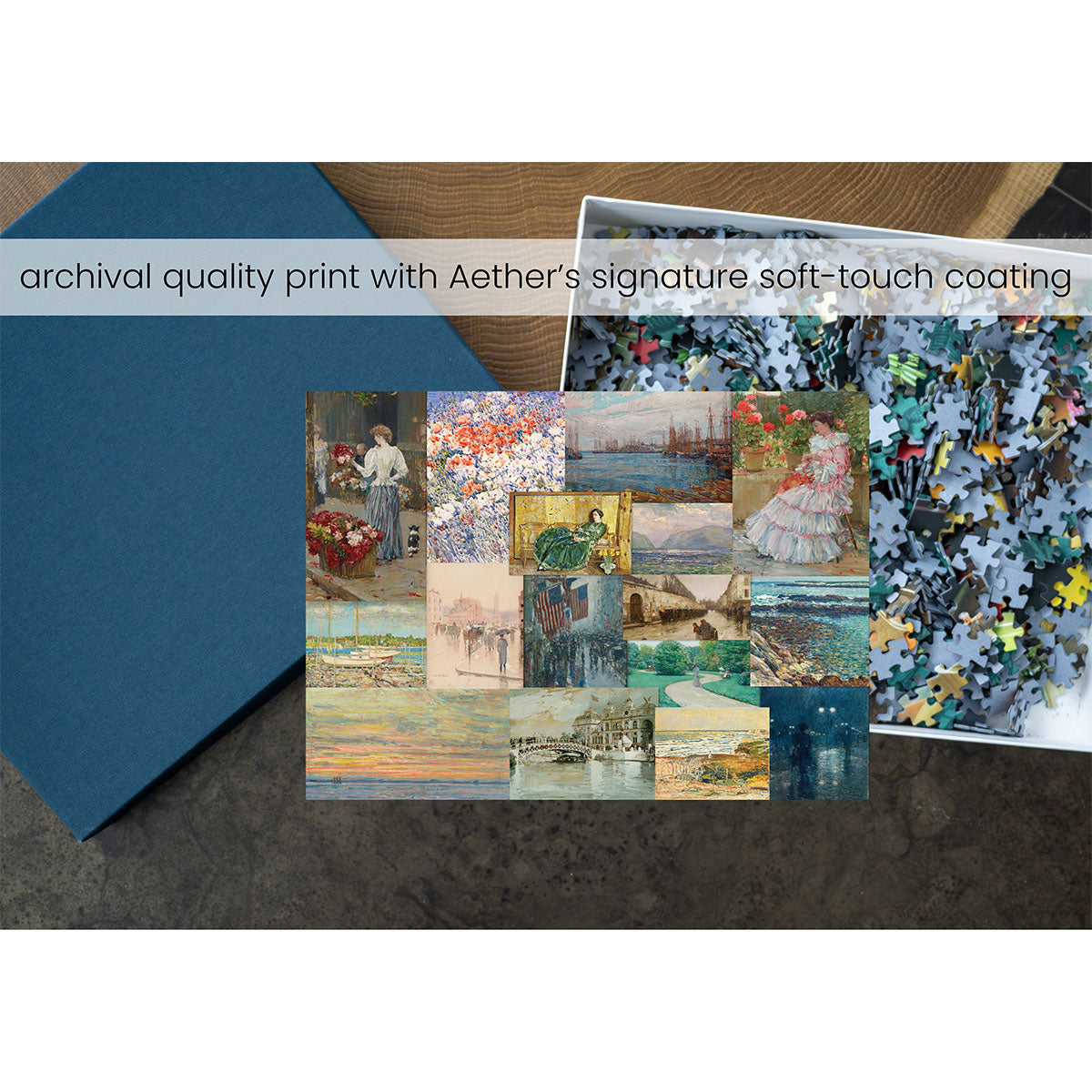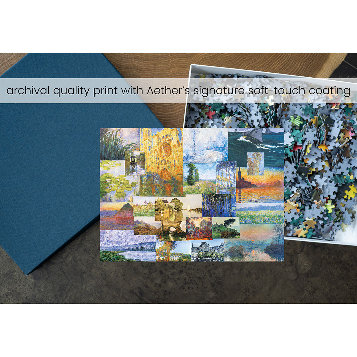 Piece together masterpieces with this collection of 14 museum-quality 1000-piece puzzles that celebrate the greats—from Impressionist light studies to bold post-Impressionist color and masterful portraiture. Each puzzle is cut from thicker durable board and finished with a soft-touch, glare-free coating so details and brushwork read clearly under any light. Packaged in an elegant textured box with a velvet bag and finished art placard, these puzzles elevate puzzling into an artful experience.