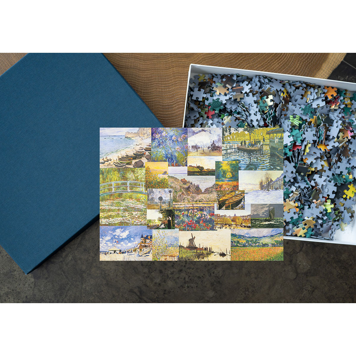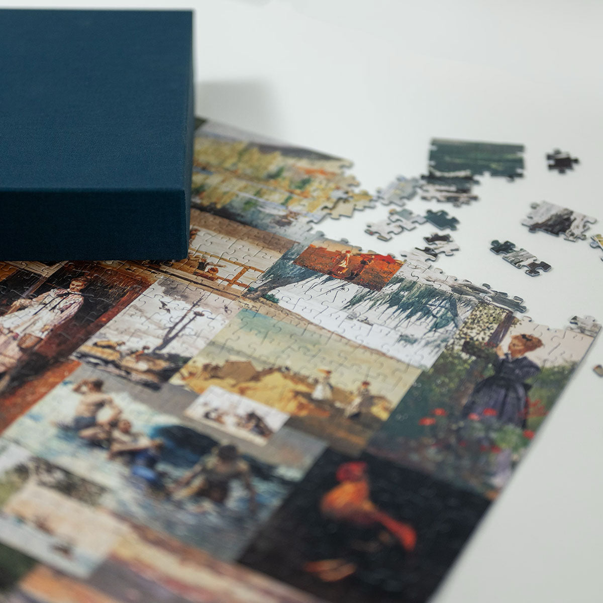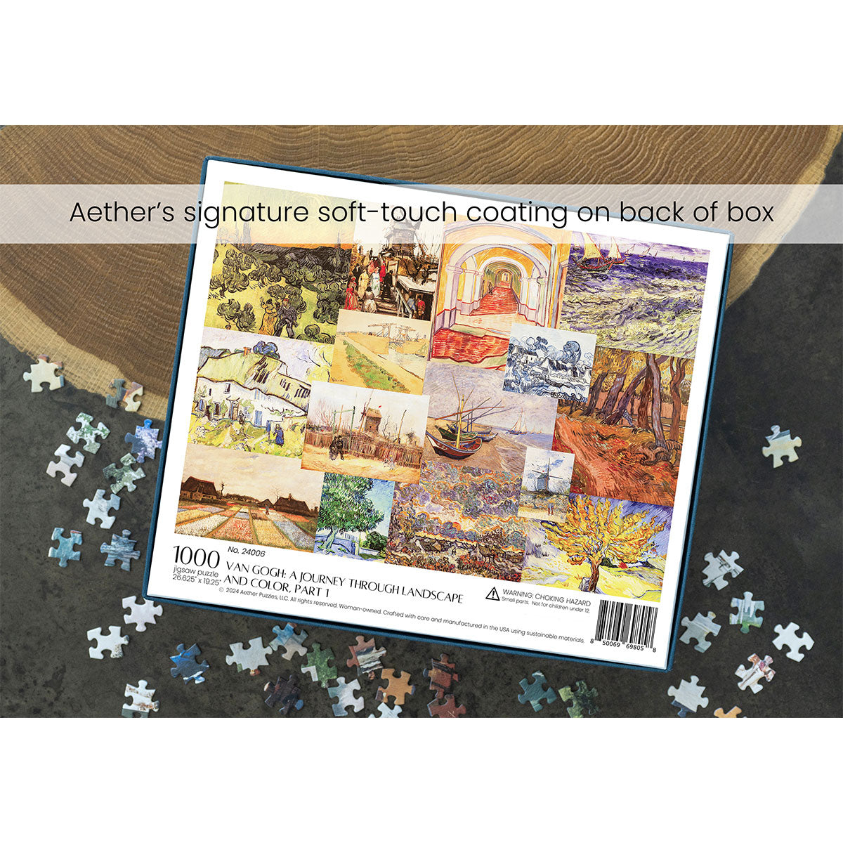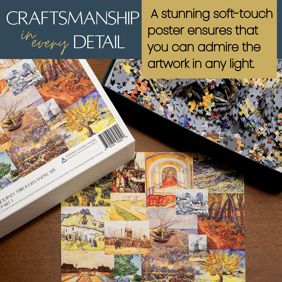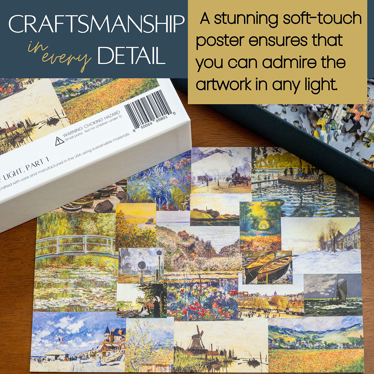 Piece together masterpieces with this collection of 14 museum-quality 1000-piece puzzles that celebrate the greats—from Impressionist light studies to bold post-Impressionist color and masterful portraiture. Each puzzle is cut from thicker durable board and finished with a soft-touch, glare-free coating so details and brushwork read clearly under any light. Packaged in an elegant textured box with a velvet bag and finished art placard, these puzzles elevate puzzling into an artful experience.