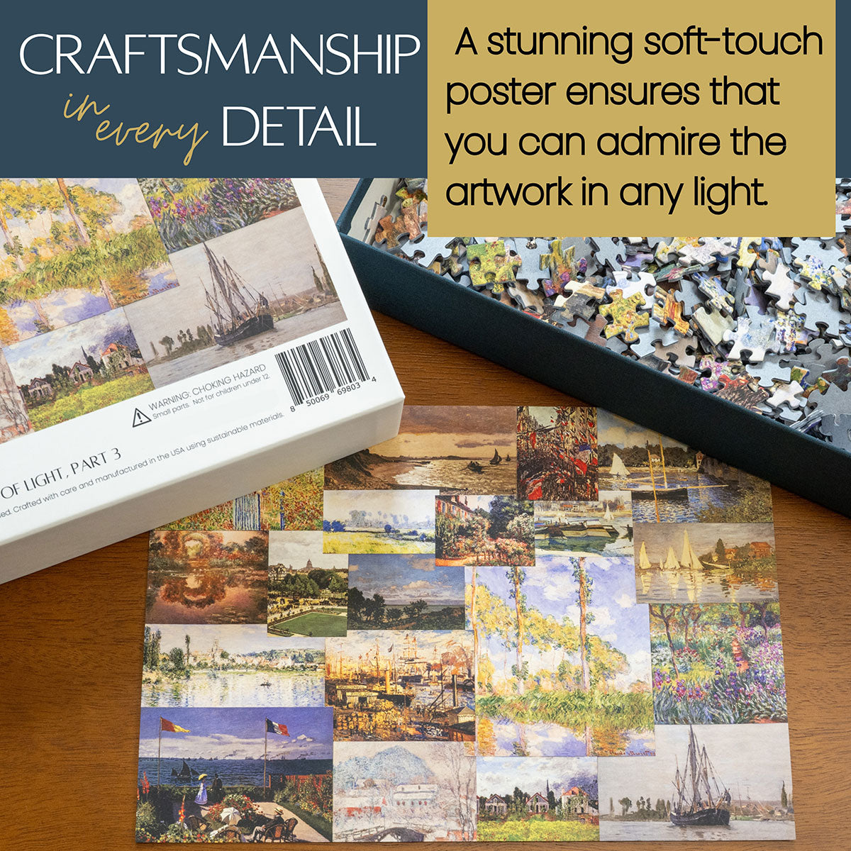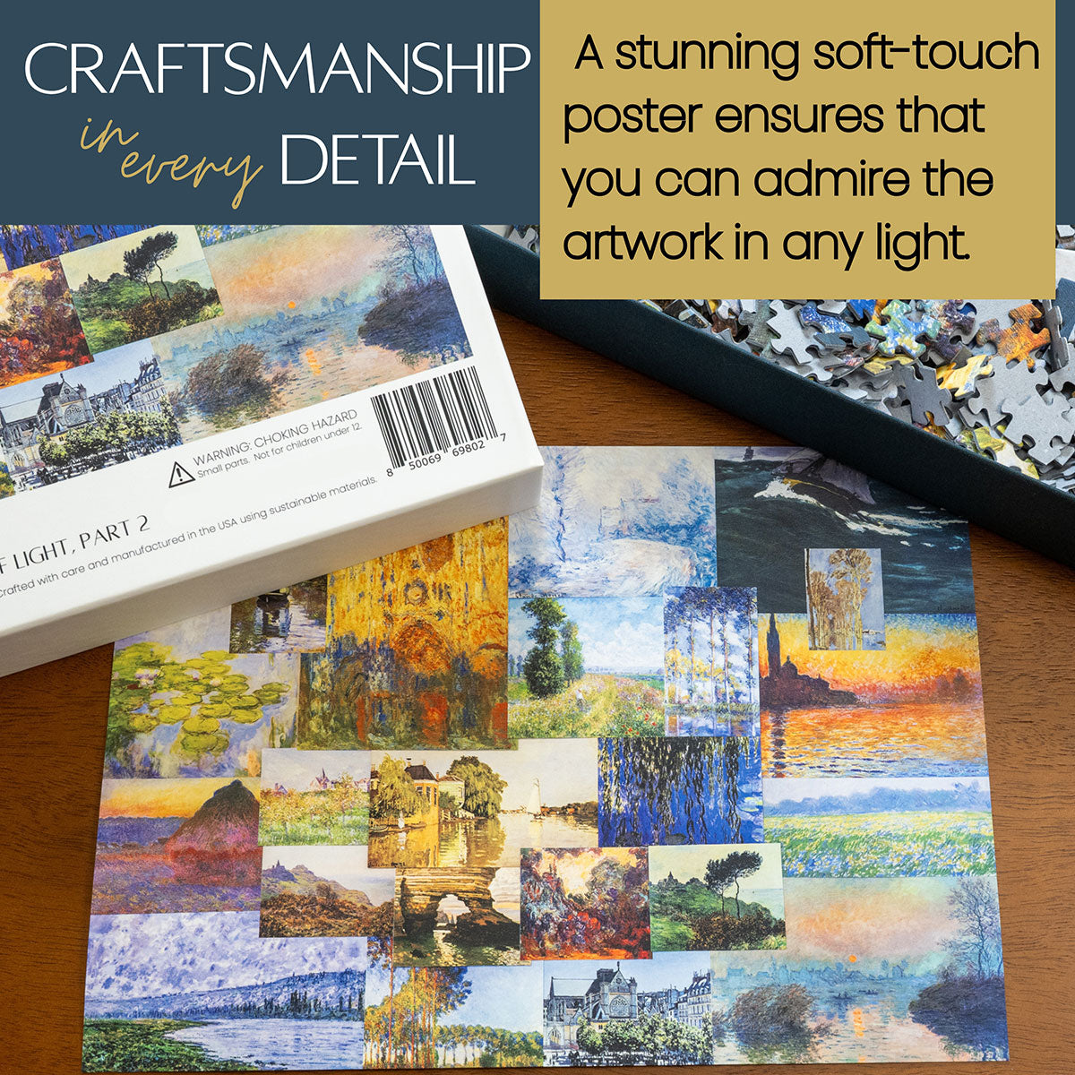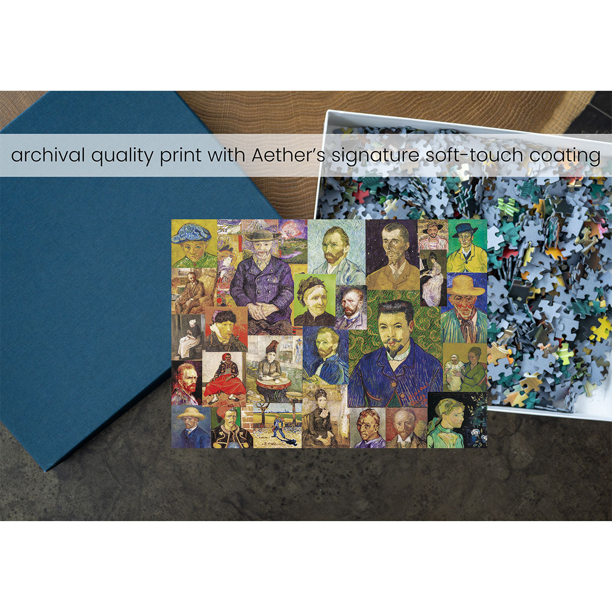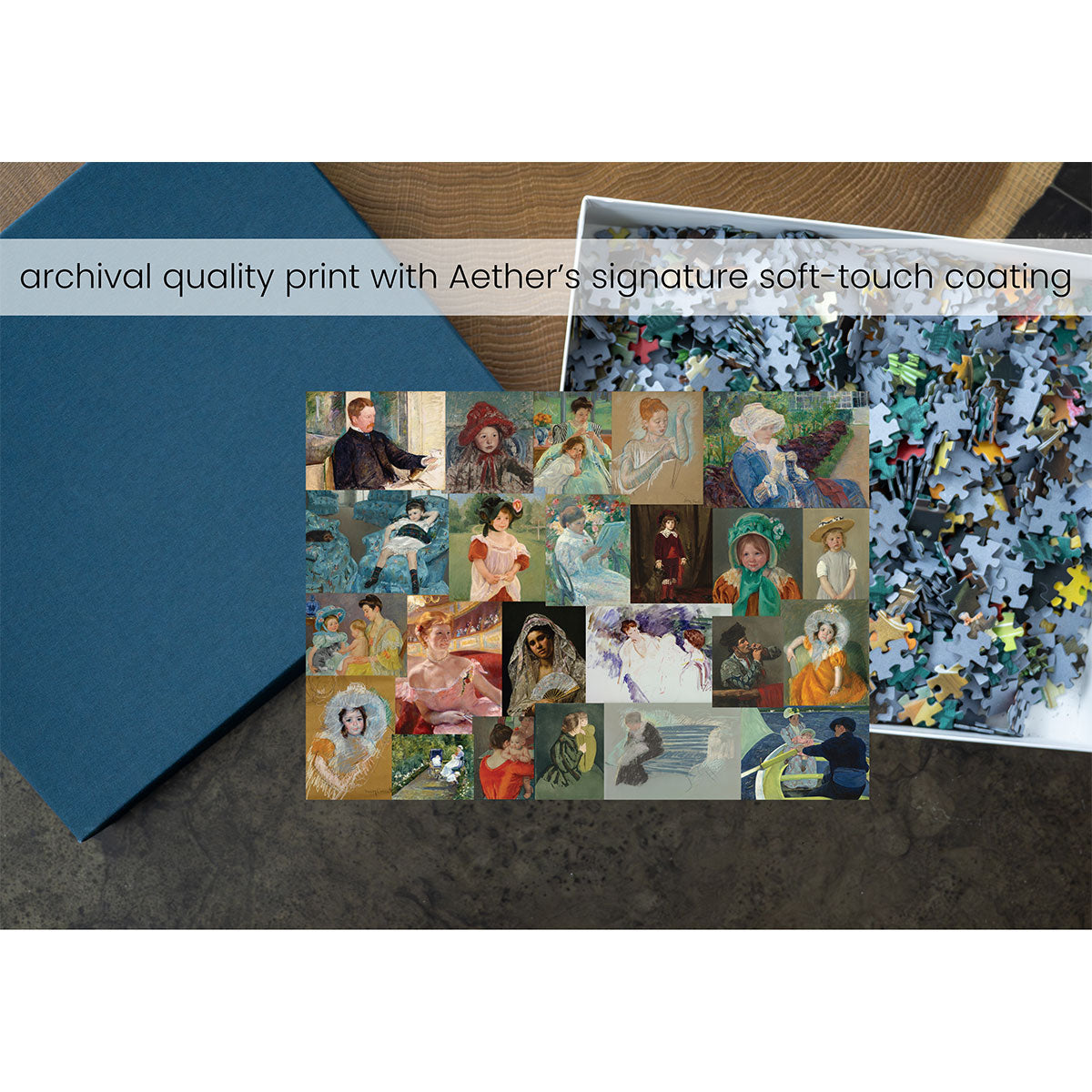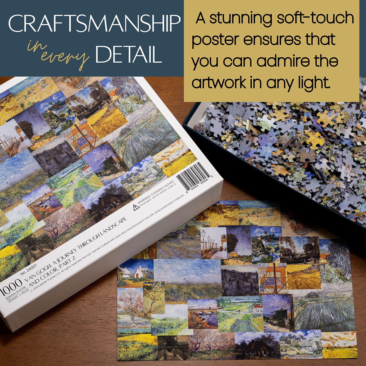 Piece together masterpieces with this collection of 14 museum-quality 1000-piece puzzles that celebrate the greats—from Impressionist light studies to bold post-Impressionist color and masterful portraiture. Each puzzle is cut from thicker durable board and finished with a soft-touch, glare-free coating so details and brushwork read clearly under any light. Packaged in an elegant textured box with a velvet bag and finished art placard, these puzzles elevate puzzling into an artful experience.