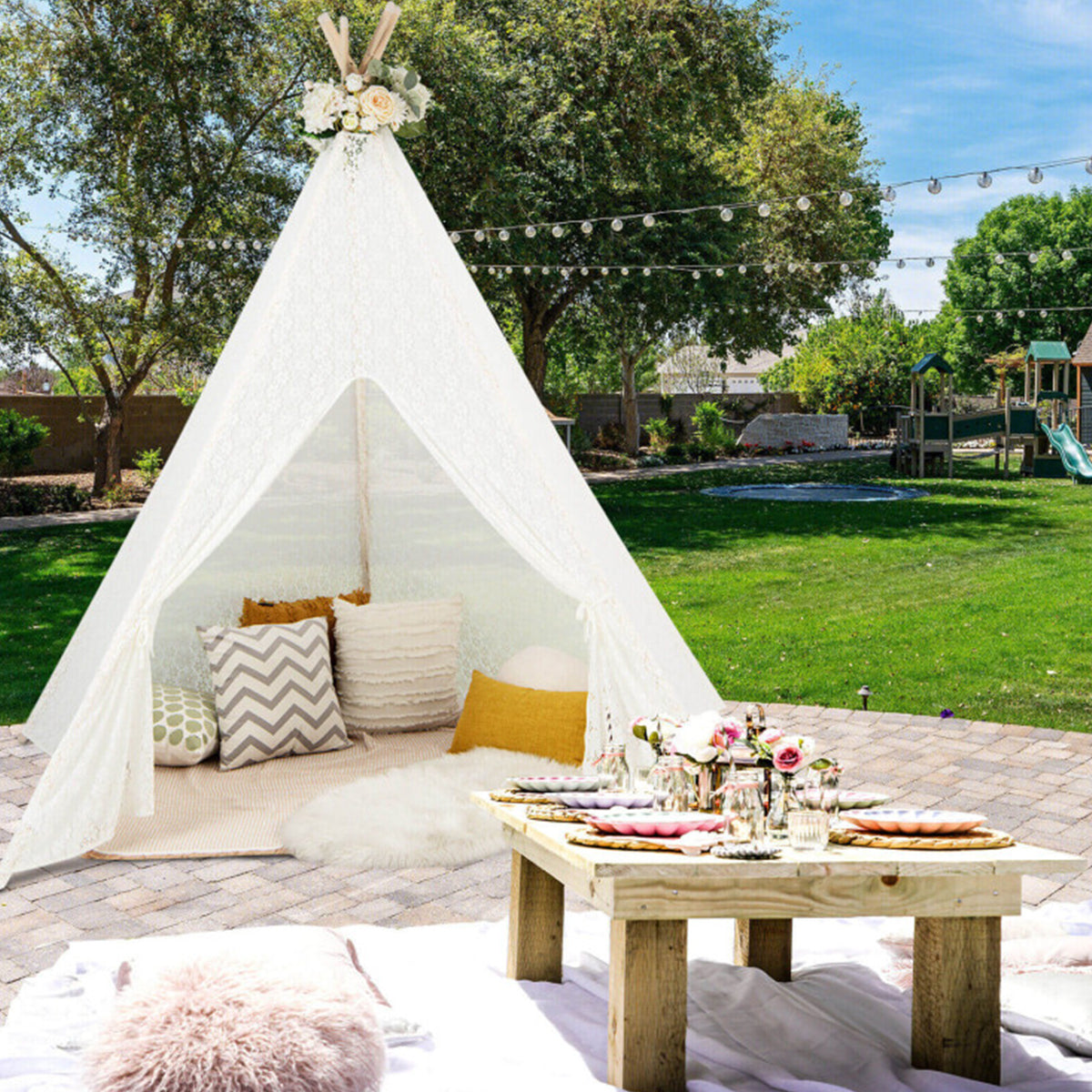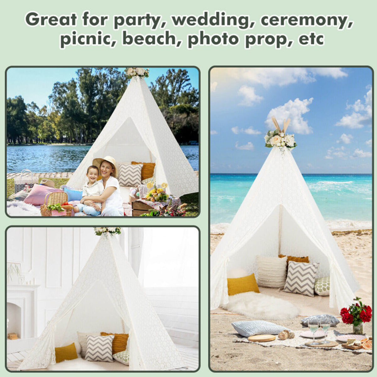 The Kids Lace Teepee Play Tent with Colorful String Lights offers a beautiful, enchanting space for children and adults alike. Designed with exquisite white lace, this tent creates a dreamy atmosphere that is perfect for imaginative play, reading, or simply relaxing. The included LED star lights add a touch of magic, turning any space into a small fairy tale world. With its generous dimensions of 80.5'' x 75'' x 85'', the tent comfortably accommodates 3-5 kids or 1-2 adults, making it a versatile addition to any home. Built with a sturdy frame made from 100% solid pine wood, this teepee is both stable and durable, featuring thick ropes and non-slip foot pads for added safety. The lightweight, easy-to-assemble design ensures that the tent can be set up quickly, whether indoors or outdoors. Ideal for various occasions such as weddings, parties, or as a unique photo prop, this lace teepee is sure to add a romantic and luxurious touch to any setting.