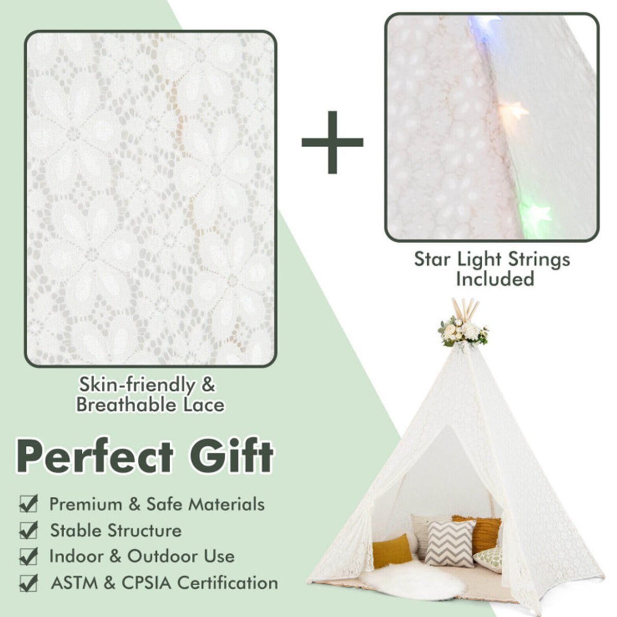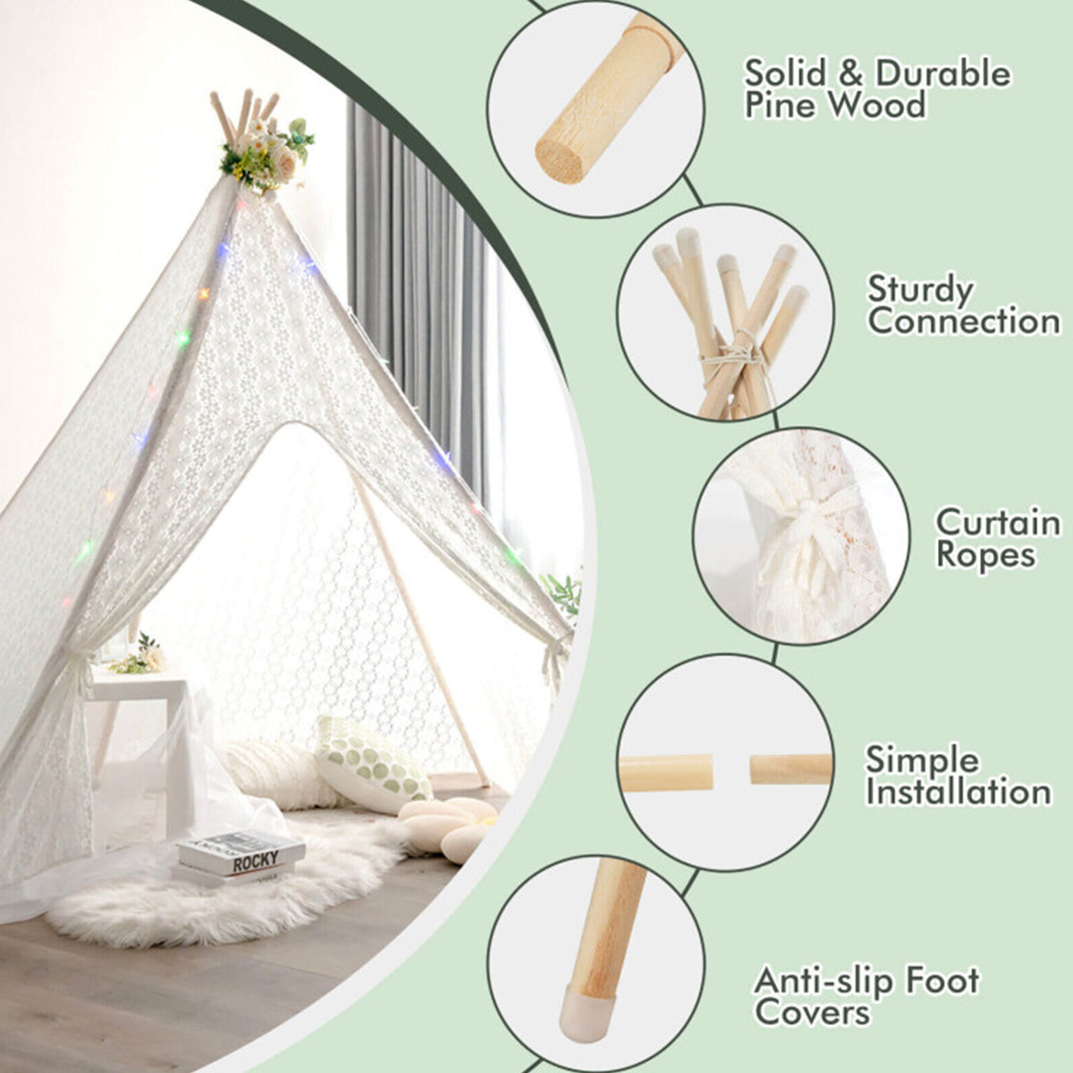 Kids Lace Teepee Play Tent with Colorful String Lights