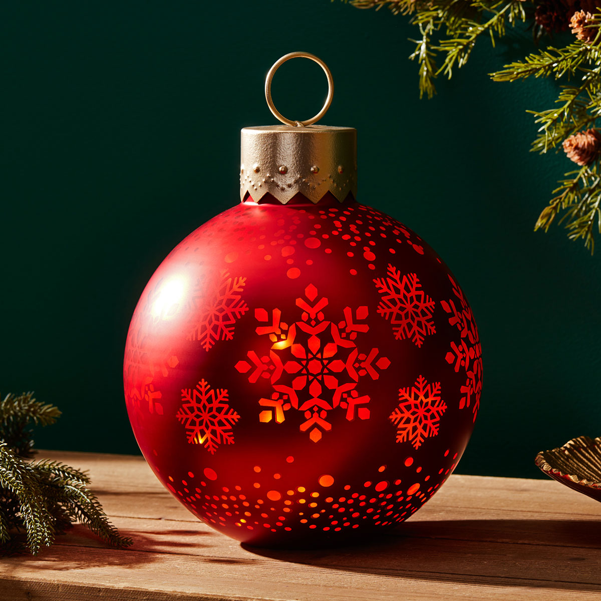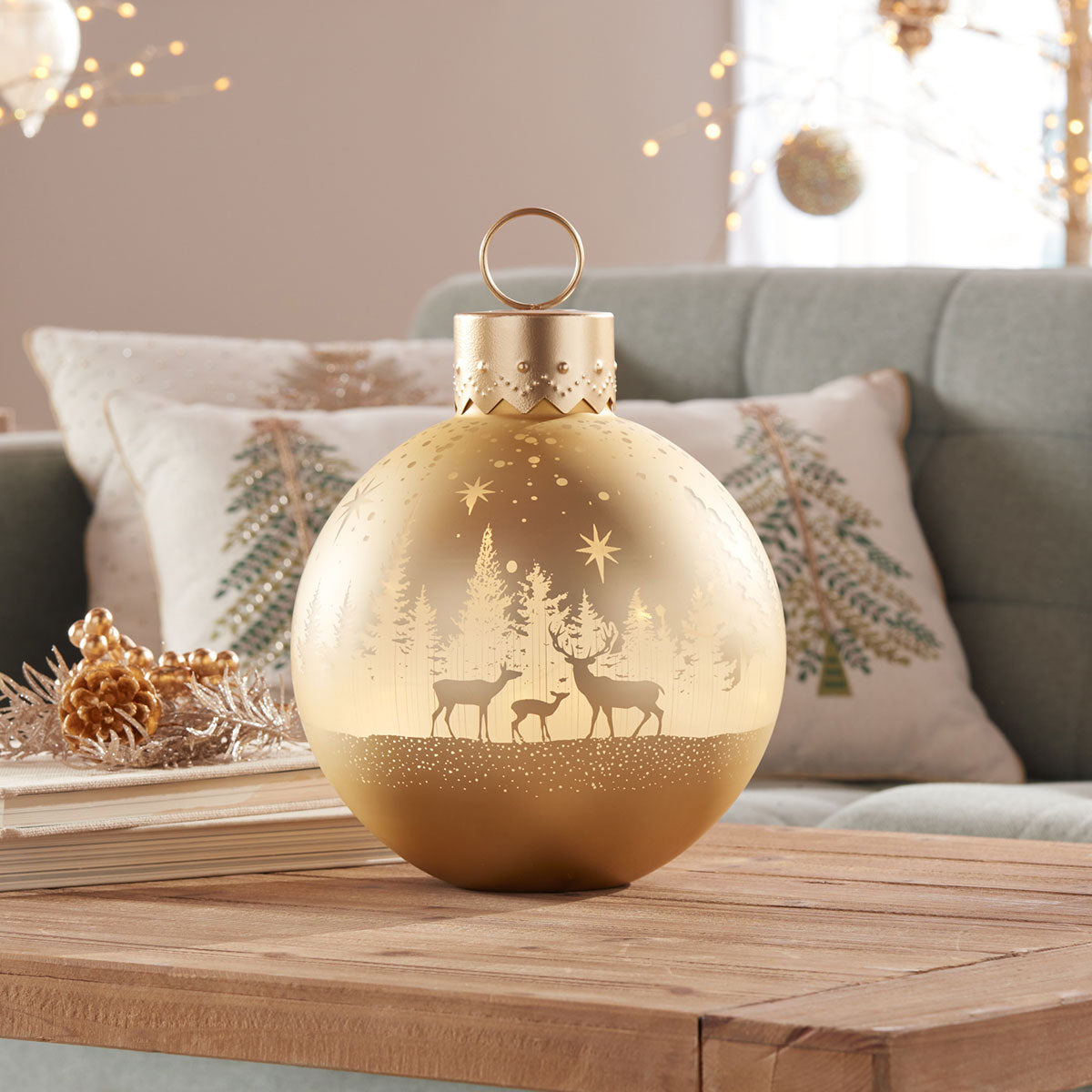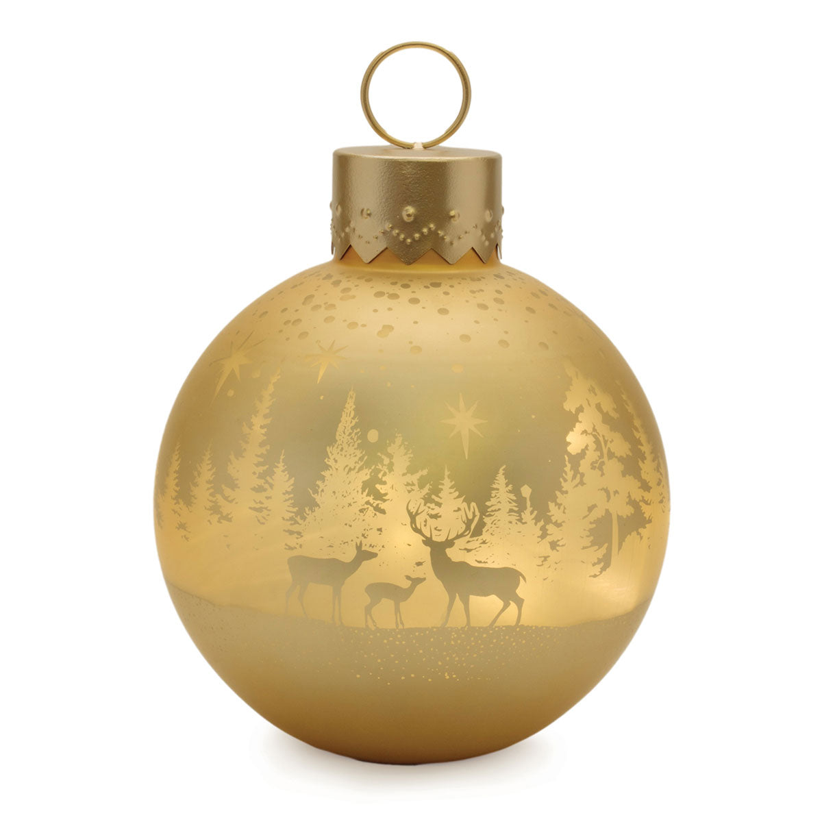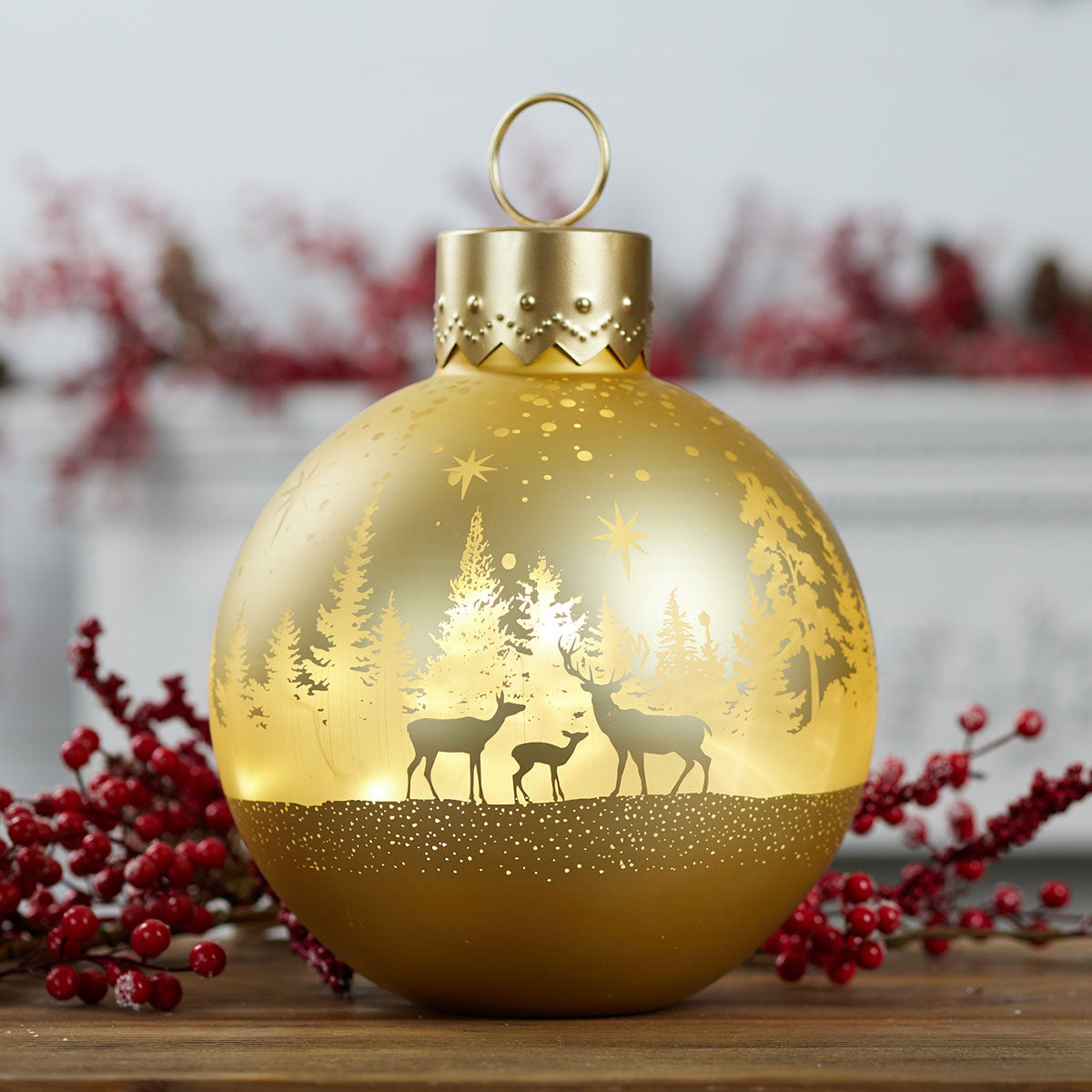 Add serene winter charm to your holiday décor with the LED Tabletop Ornament, available in elegant red or gold finishes. This beautifully crafted ornament features a rustic pine forest scene with deer, delicately accented with snow and a chic frosted glass exterior. The warm white LED light inside emits a soft, inviting glow, making it an ideal centerpiece for tabletops, shelves, or mantels. Its cozy illumination enhances any seasonal display with festive warmth and timeless elegance.