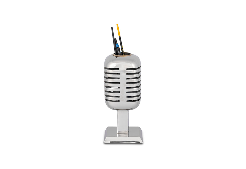 Based on the vintage microphones that defined the 1940s, our Microphone Pencil Holder has an authentic look and feel, with its polished solid cast aluminum and brass trim. Whether you love the Big Bands, rockabilly or vintage radio dramas, this weighted pencil holder makes a great conversation piece on any desk.