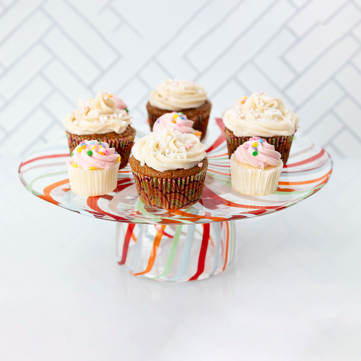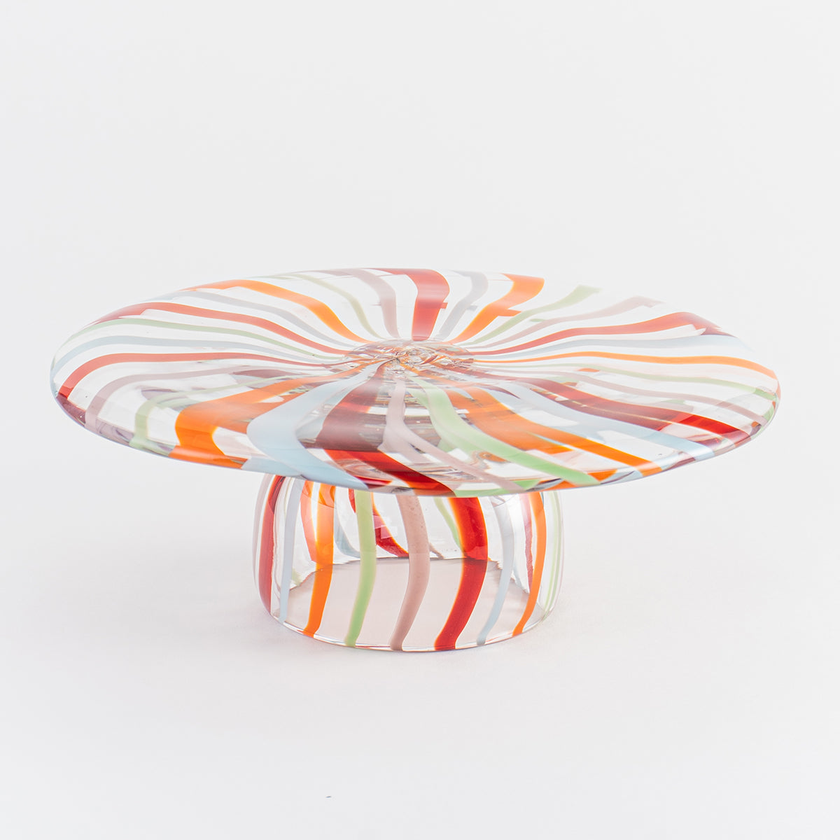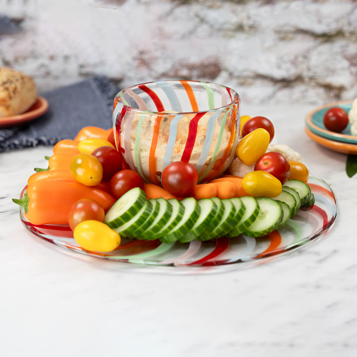 Add a touch of elegance and versatility to your entertaining with the Reversible Glass Cake Stand/Chip and Dip Platter. This unique piece is made from clear glass and features solid multi-color stripes, making it a standout on any table. Use it as a stunning cake stand to beautifully present your desserts, or flip it over to serve as a chip and dip platter for your next gathering. Its dual-purpose design makes it a must-have for anyone who loves to entertain with style. Not only is it functional, but it also serves as a piece of art, enhancing the aesthetic of your buffet or dining table. Whether you're hosting a casual get-together or a formal event, this multi-use glass stand adds a touch of sophistication to any occasion. Its durable glass construction ensures it will be a cherished piece for years to come, making it both a practical and beautiful addition to your serveware collection.