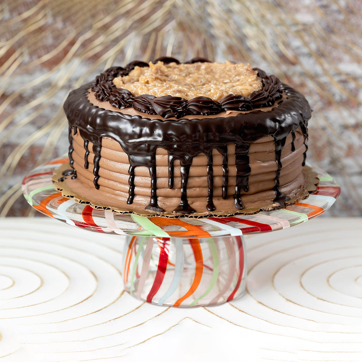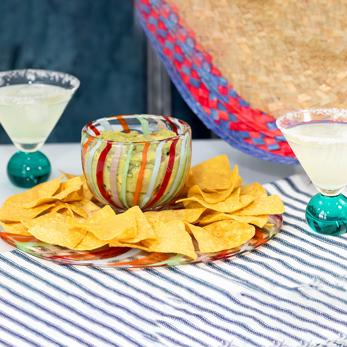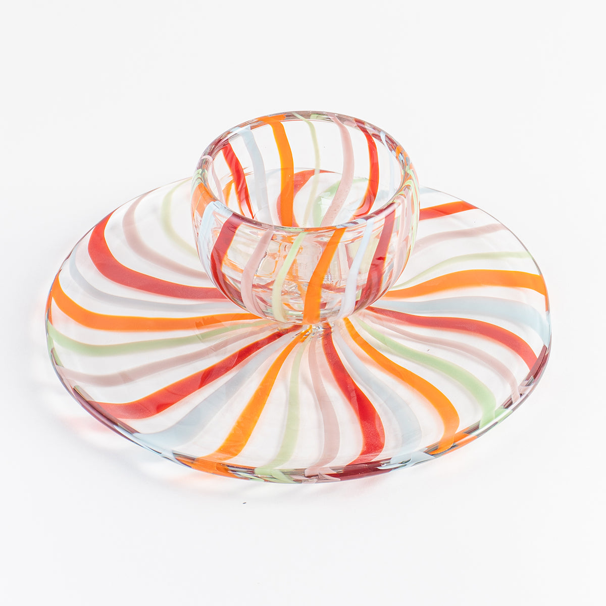 Add a touch of elegance and versatility to your entertaining with the Reversible Glass Cake Stand/Chip and Dip Platter. This unique piece is made from clear glass and features solid multi-color stripes, making it a standout on any table. Use it as a stunning cake stand to beautifully present your desserts, or flip it over to serve as a chip and dip platter for your next gathering. Its dual-purpose design makes it a must-have for anyone who loves to entertain with style. Not only is it functional, but it also serves as a piece of art, enhancing the aesthetic of your buffet or dining table. Whether you're hosting a casual get-together or a formal event, this multi-use glass stand adds a touch of sophistication to any occasion. Its durable glass construction ensures it will be a cherished piece for years to come, making it both a practical and beautiful addition to your serveware collection.