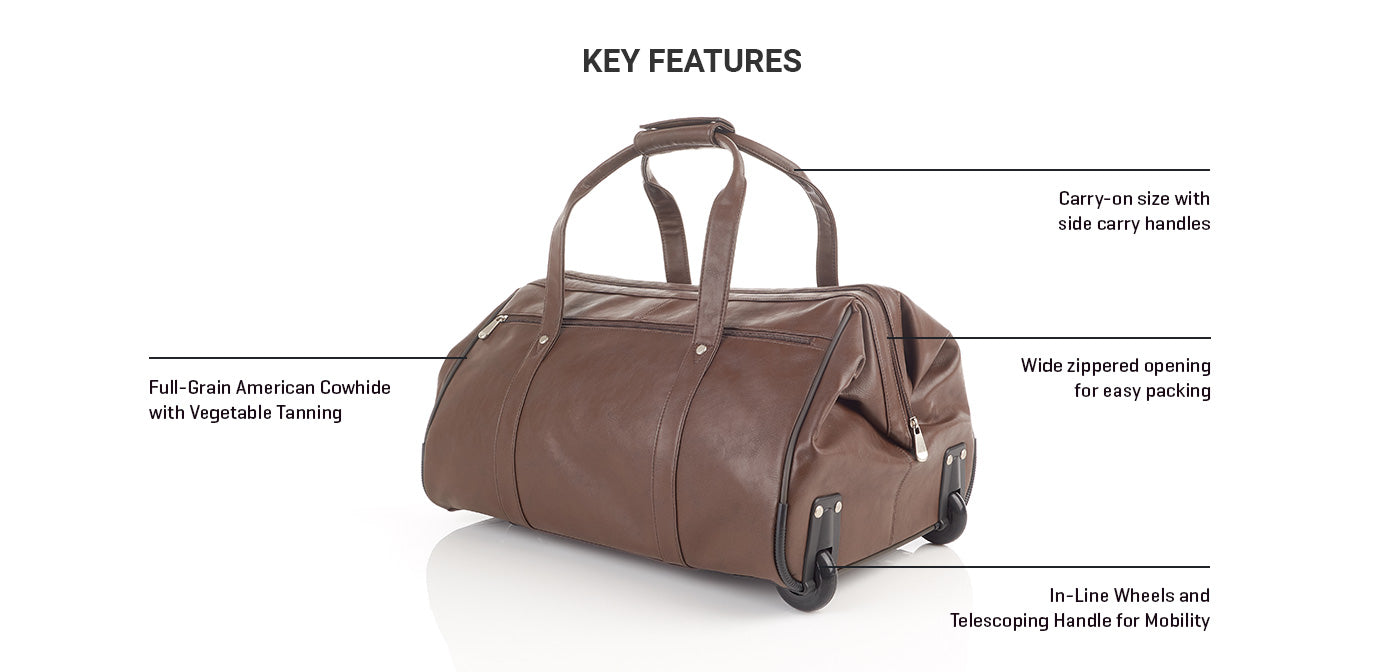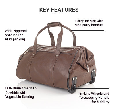 The Rolling Wide Mouth Duffel Bag is a premium travel companion made from full-grain American cowhide. Designed to get softer, smoother, and darker over time, it boasts a wide zippered opening for effortless packing and unpacking. Equipped with in-line wheels and a telescoping trolley handle, it ensures smooth mobility, while side carry handles provide added convenience. Available in classic Tan, Brown, or Black, this stylish and durable carry-on is perfect for business trips or weekend getaways.